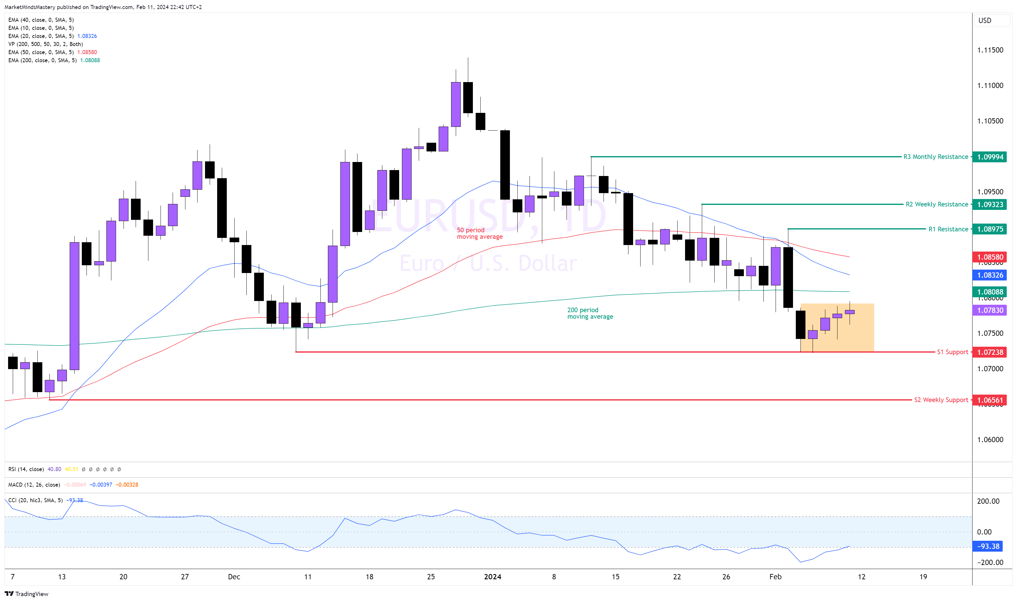 في أعقاب الاختراق والإغلاق دون المتوسط المتحرك لفترة 200 فترة، أجبرت شمعة الابتلاع الهابطة السعر على التحول إلى الاتجاه الهبوطي يوم الإثنين الماضي، كما كان متوقعًا. ومنذ ذلك الحين، اختبر السعر دعم الدعم S1 حول مستوى 1.07238 وارتد لأعلى، وعلى مدار أيام التداول الأربعة السابقة، تداول السعر بين قمة وقاع شمعة يوم الثلاثاء. وعادة ما يؤدي الارتداد عن الدعم إلى نشاط كبير، ويتحرك السعر لأعلى بشكل ملحوظ. ويقع مؤشر الماكد تحت الصفر، مع وجود خط الإشارة فوق خط الماكد مما يشير إلى نشاط هبوطي. إذا استمر السعر في الدفع لأعلى وتجاوز المتوسطين المتحركين لفترة 50 و 200 فترة، فإن المقاومة الثابتة الأولى، R1، هي قمة الابتلاع الهبوطي الأخير، حول 1.08975. وبعد ذلك مباشرة، وعلى مسافة 30 نقطة تقريبًا، توجد المقاومة الثابتة R2 حول 1.09323.