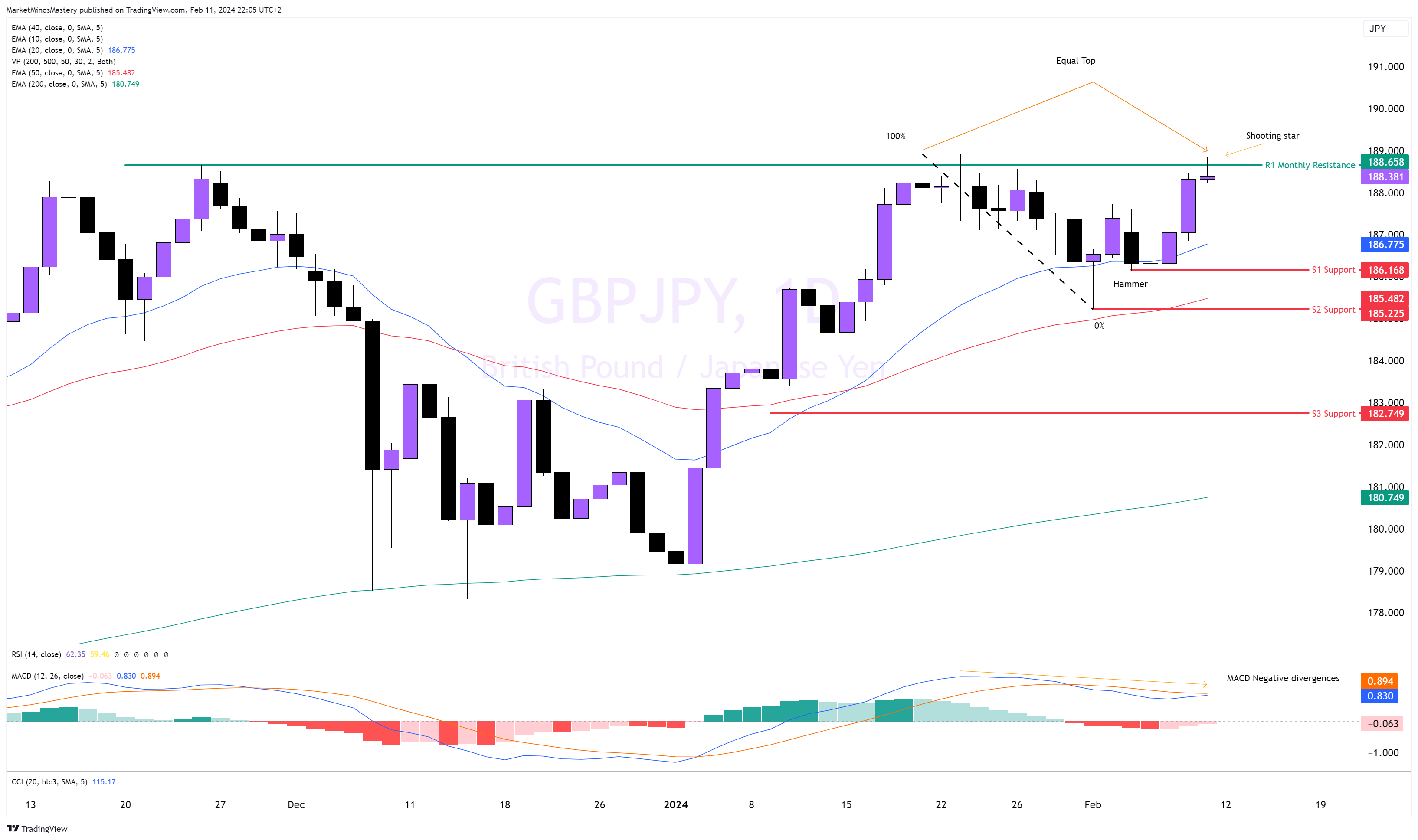 بالإضافة إلى ذلك، شكل السعر قمم متساوية. يجب أن يفهم المتداولون، في هذه المرحلة، أن تشكيل القمة المتساوية ليس قمة مزدوجة بعد. فالقمة المزدوجة هي تشكيل سعري يتأكد بعد اختراق دعم S2، وهو في هذه المناسبة، S2، هو خط العنق لنمط انعكاس قمة دوب المحتملة. إذا انخفض السعر وتحرك السعر لأسفل، فإن الدعم الأول، S1، يقع عند مستوى 186.168 تقريبًا. ويمكن أن يؤدي المزيد من الانخفاض إلى الدعم التالي، S2، حول 185.225. يمكن أن يعمل المتوسط المتحرك لـ 50 فترة أيضًا كدعم ديناميكي في هذه المنطقة. على العكس من ذلك، إذا تحرك السعر لأعلى واخترق المقاومة R1، فقد قدرنا المقاومة التالية بامتداد فيبوناتشي 200% حول 192.555.