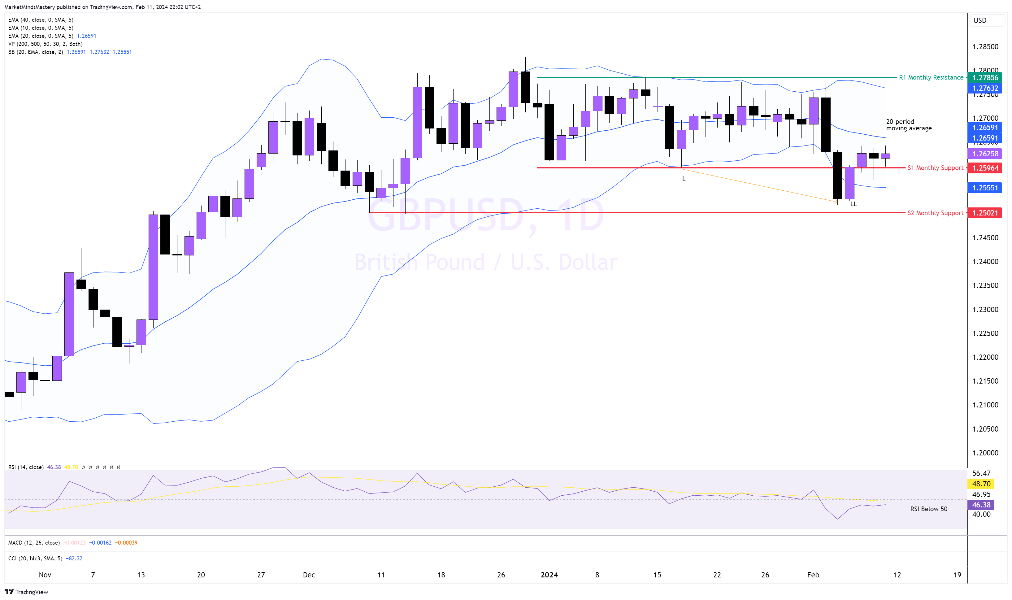 في أعقاب النطاق الذي تم إنشاؤه في الشهرين الماضيين، اخترق السعر خارج النطاق إلى الجانب السفلي، كما أوضحنا في تحليل الأسبوع الماضي، وخلق قاعًا منخفضًا، كما هو موضح في الرسم البياني أعلاه. بعد الاختراق، لم يدفع البائعون السعر إلى ما دون 1.255. ونظرًا لأن منطقة 1.25 منطقة حيوية، نتوقع نشاط تداول مكثف. ولذلك، وجد السعر دعمًا وتحرك لأعلى. ونتيجة لذلك، عاد السعر داخل نطاقات بولينجر باند ولا يزال يتداول دون المتوسط المتحرك لفترة 20. إذا استمر السعر في الارتفاع، يمكن أن يعمل المتوسط المتحرك لـ20 فترة كمتحرك ديناميكي، وهو المقاومة، ويجبر السعر على الهبوط. إذا تحرك السعر فوق المتوسط المتحرك لـ20 فترة، فإن المقاومة الثابتة الأولى، R1، ستكون المنطقة التي استضافت مؤخرًا نشاط تداول هائل، كما هو موضح على الرسم البياني. وهو مستوى شهري يبلغ حوالي 1.2775. ويتكون من النطاق العلوي لمؤشر بولينجر باند. وعند الانخفاض والتحرك لأسفل نجد دعم S1 حول 1.255 ودعم S2 حول 1.25. يقع مذبذب مؤشر القوة النسبية تحت مستوى 50، مما يشير إلى تحيزات هبوطية.