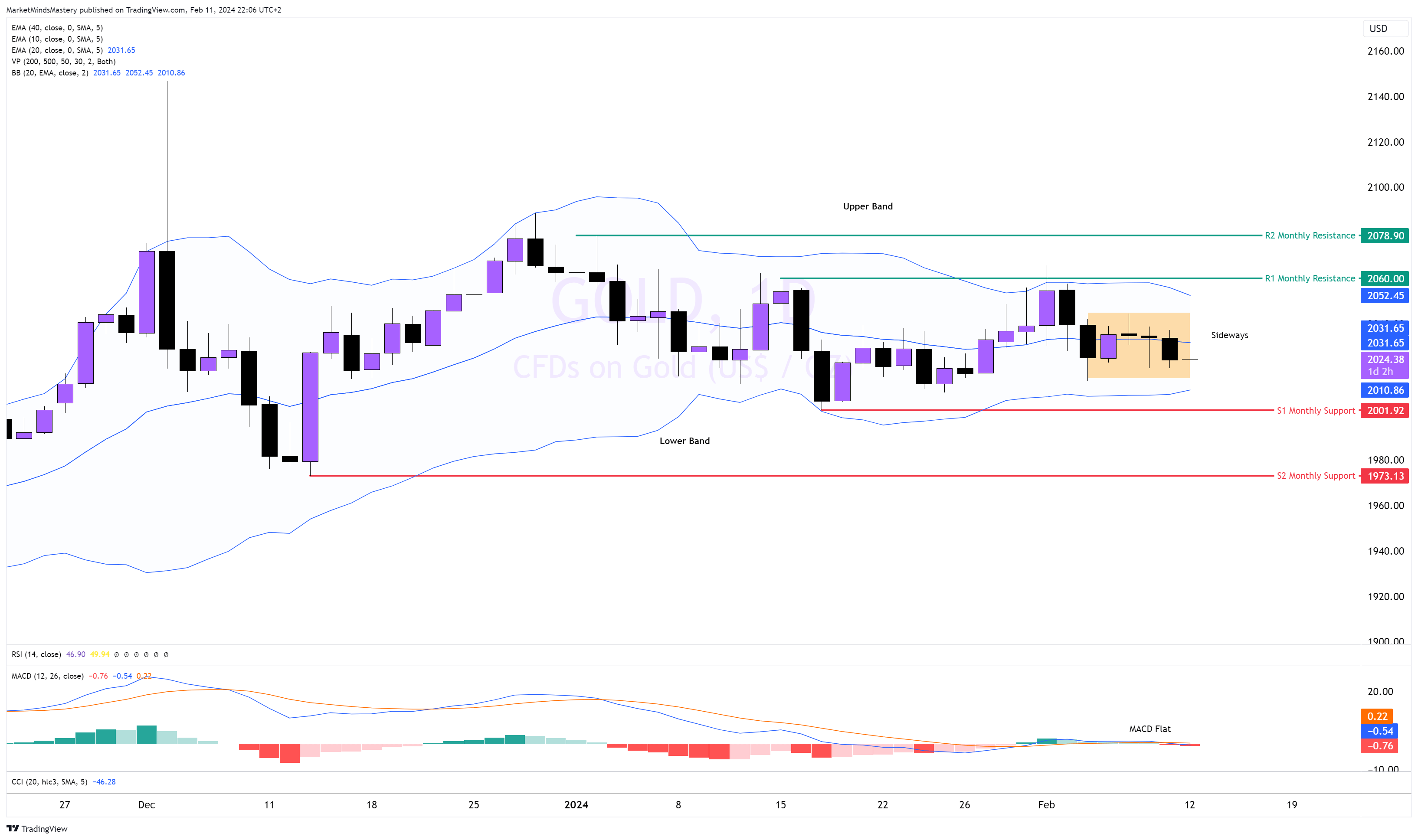 في أعقاب أخبار الاقتصاد الكلي التي صدرت الأسبوع الماضي، دخل الذهب في مرحلة توطيد/دون اتجاه. لا يزال السعر يحوم حول المتوسط المتحرك لـ 20 فترة من نطاق بولينجر. النطاقات العلوية والسفلية ثابتة، ومؤشر الماكد ثابت حول خط الصفر. كل هذا يدل على أن السعر غير موجه. لذلك، إذا تحرك السعر للأسفل هذا الأسبوع، سنجد الدعم الأول، S1، حول مستوى 2000. والمستوى هو رقم مستدير؛ وعادة ما يتطلع المتداولون إلى التداول من هذا المستوى حيث يتوقعون تحركات اتجاهية. إذا اخترق السعر ما دون S1 وتحرك إلى الأسفل، فإن منطقة الدعم التالية، S2، تقع حول عام 1973. وعلى العكس من ذلك، إذا تحرك السعر لأعلى، تصبح منطقة المقاومة الأولى، R1، هي المستوى حول 2060. ويمكن أن يؤدي الإغلاق فوقه والتحرك لأعلى إلى إيجاد المقاومة التالية، R2، عند مستوى 2078 تقريبًا. يمكن أن يجذب هذا المستوى الشهري الكثير من عمليات تبادل الأوامر بين المشترين والبائعين.