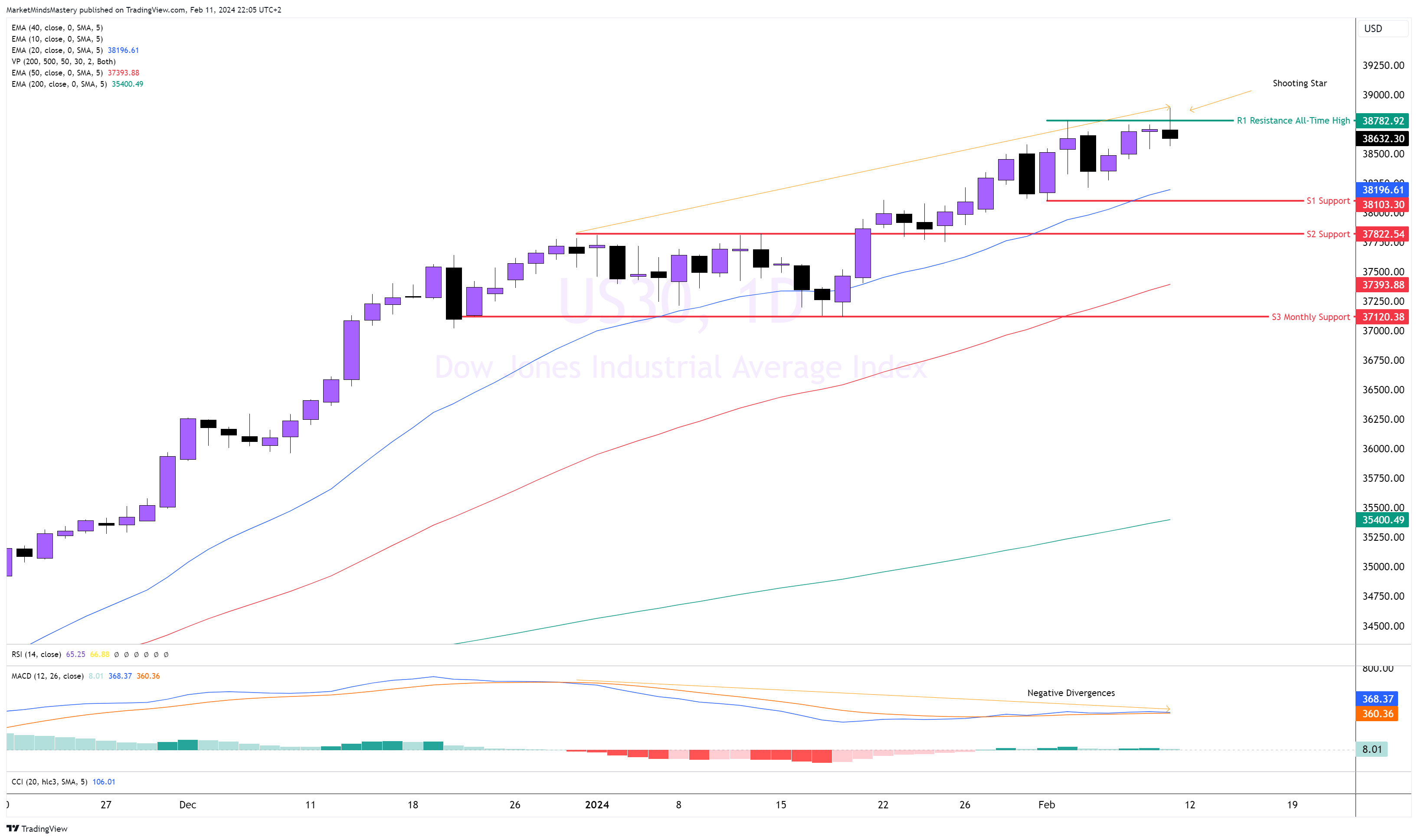 بعد الحركة الصعودية في مؤشر US30 التي بدأت منذ أربعة أشهر عندما تقاطعت المتوسطات المتحركة، يرتفع السعر بثبات مع سلسلة من القمم المرتفعة والقيعان المرتفعة - كما أن جميع المتوسطات المتحركة الثلاثة، 20 و50 و200، تشير إلى الأعلى. يقع مؤشر MACD فوق خط الصفر. كل هذه علامات على سوق صاعدة. على الرغم من ذلك، وصل السعر الأسبوع الماضي إلى أعلى مستوى له على الإطلاق، ولكن مؤشر MACD لم يلحق به. لذلك، يظهر تباعد هبوطي على المؤشر، مما يدل على الإنهاك خلال الحركة الصعودية الأخيرة. ظهرت شمعة شهاب انعكاسية يوم الجمعة الماضي حول مستوى 38782. إذا انخفض السعر، فإن منطقة الدعم الأولى، S1، تقع تقريبًا عند مستوى 38103، أعلى قليلاً من المتوسط المتحرك لـ 20 فترة. وفي حالة حدوث مزيد من الانخفاض من هذا المستوى، سيجد السعر الدعم التالي، S2، حول 37822. أما إذا ارتفع السعر واخترق قمة شمعة الشهاب، فسوف يسجل قمة جديدة على الإطلاق;