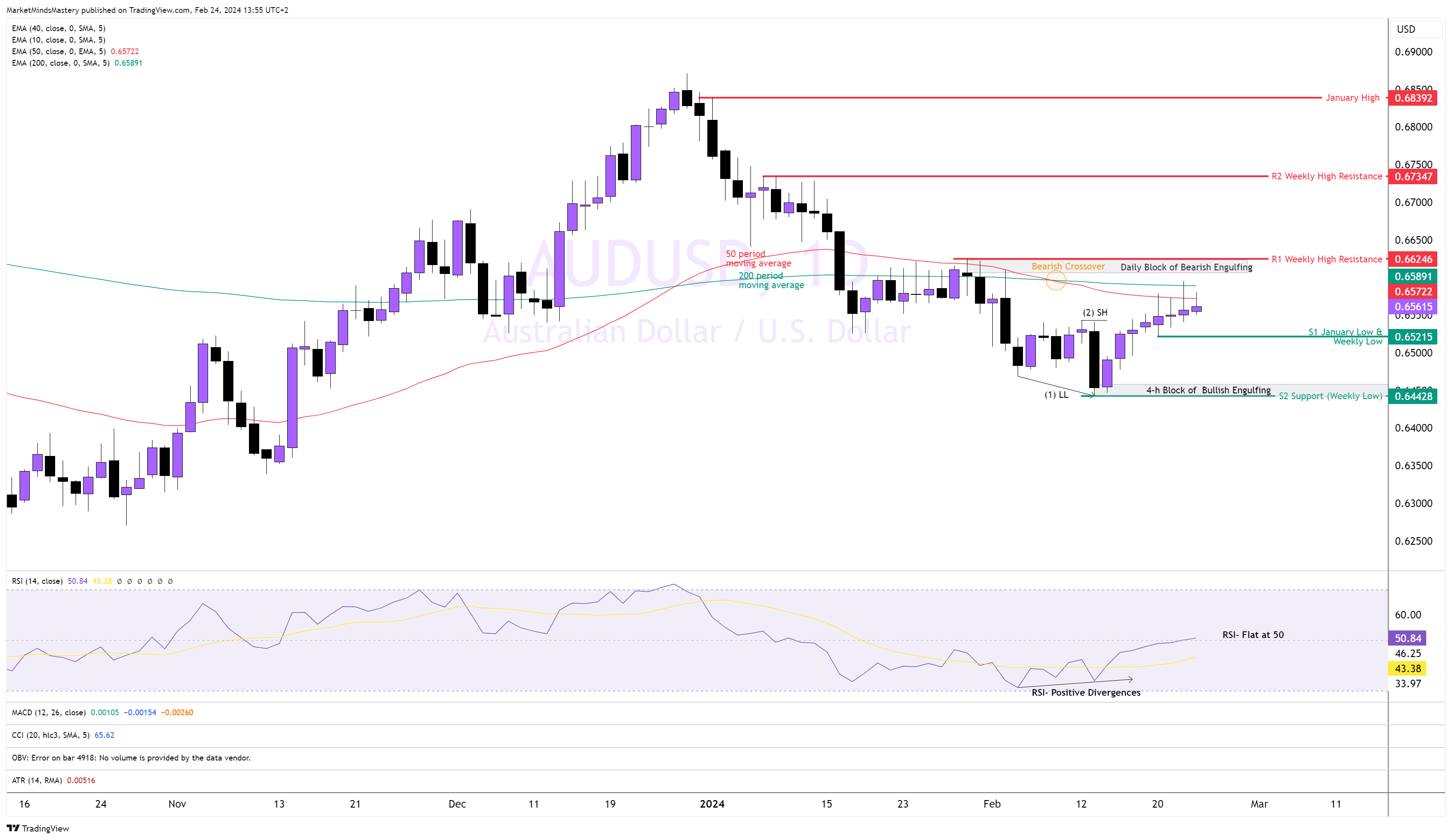 Außerdem wurden die Preise zurückgewiesen und schlossen unter den 50 und den 200 Perioden gleitenden Durchschnitten. Der RSI ist flach und liegt bei 50. Der Kurs hat an Punkt (1) eine LL gebildet und drei Tage später 100 % der Bewegung zurückgenommen, und an Punkt (2) hat er das Swing High durchbrochen. Wenn der Kurs in der nächsten Woche weiter ansteigt, liegt der erste Widerstand, R1, im Bereich um 0,66246, und dies ist ein Wochenhöchstkurs. Fällt der Kurs dagegen und bewegt sich nach unten, ist die Unterstützung S1 das Januartief, das aus dem Tief der letzten Woche bei etwa 0,65215 besteht. Ein weiterer Kursrückgang könnte die S2-Unterstützung bei etwa 0,64428 testen.