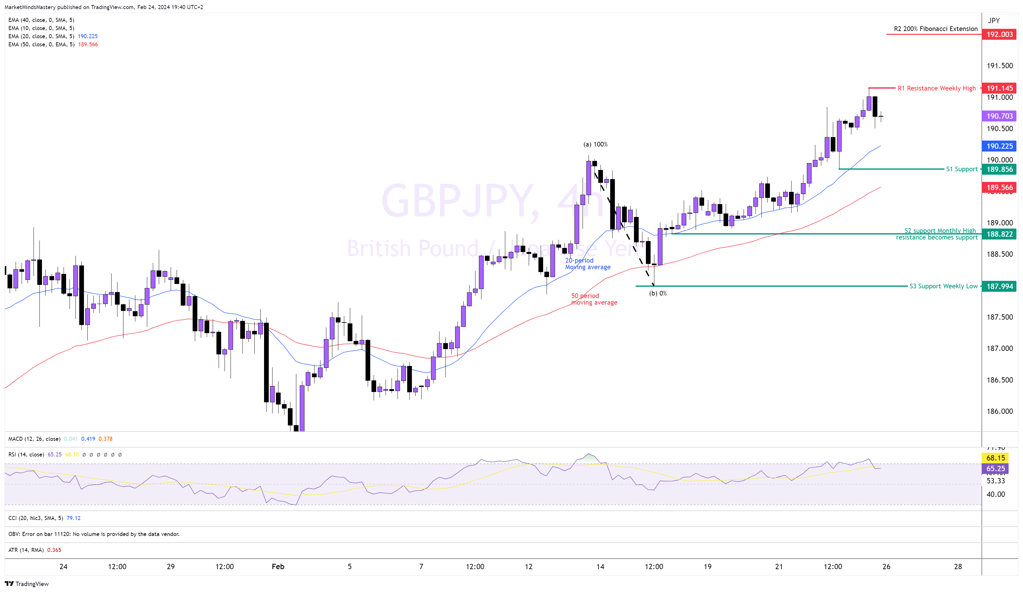 Infolge der höheren Höchst- und Tiefststände wurde ein Aufwärtstrend definiert, der vor einigen Wochen begann. Der Preis stieg in der letzten Woche und erreichte ein neues Wochenhoch um die Marke von 191,145. Die 20-Perioden-Linie liegt über dem gleitenden 50-Perioden-Durchschnitt, was auf Kaufdruck auf dem Markt hindeutet. Gleichzeitig vergrößert sich der Abstand zwischen den gleitenden Durchschnitten, was auf einen soliden Aufwärtsdruck hindeutet. Der MACD hat die Nulllinie überschritten, und die MACD-Linie handelt über der Signallinie, was ebenfalls ein zinsbullisches Zeichen ist. Wenn der Kurs also weiter steigt, wird das jüngste Hoch den ersten Widerstand R1 bei 191,145 bilden. Wenn der Kurs diesen durchbricht und sich darüber bewegt, wird der nächste Widerstand anhand der Fibonacci-Erweiterung von Punkt (a) zu Punkt (b) geschätzt, die das jüngste Retracement misst. Der R2-Widerstand dürfte also bei 192,000 liegen.