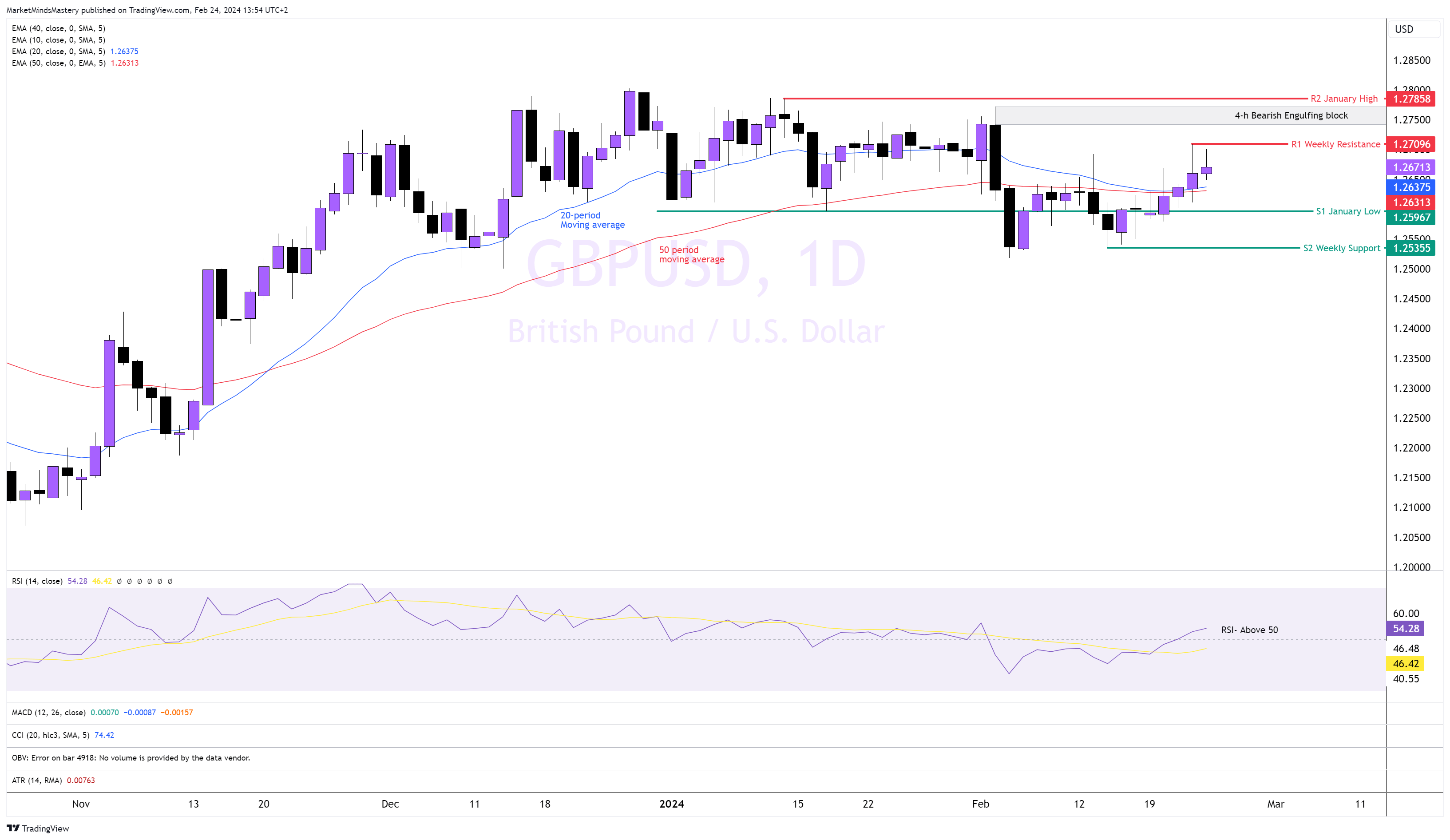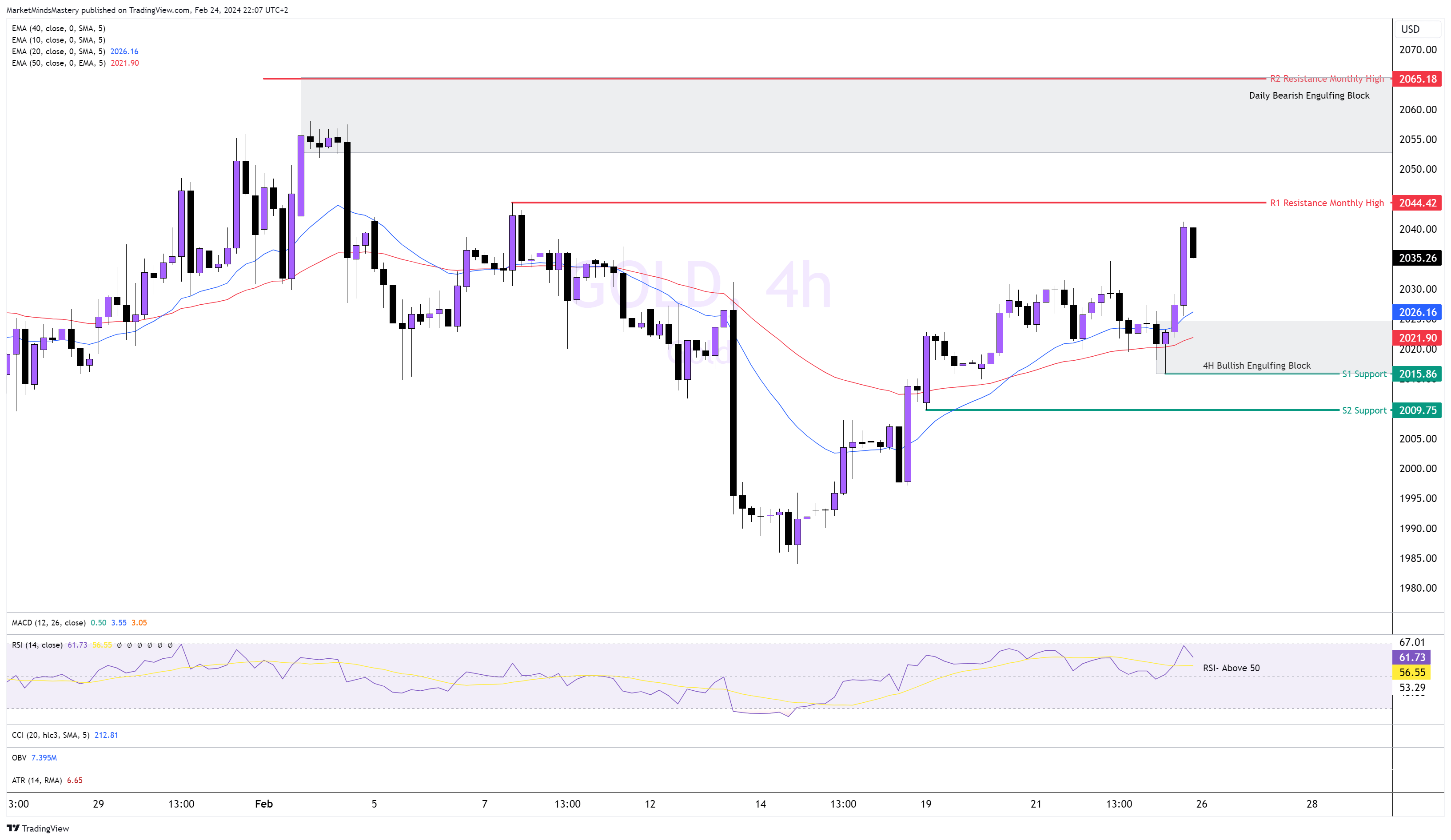 Nach dem Aufwärtstrend, der Anfang Februar begann, bewegt sich der Preis auf dem 4-Stunden-Chart innerhalb einer Reihe von höheren Hochs und höheren Tiefs nach oben. Die 20-Periode liegt über dem 50-Periode gleitenden Durchschnitt, was zinsbullische Implikationen hat. Der RSI-Oszillator liegt über 50, was auf einen bullishen Markt hindeutet.