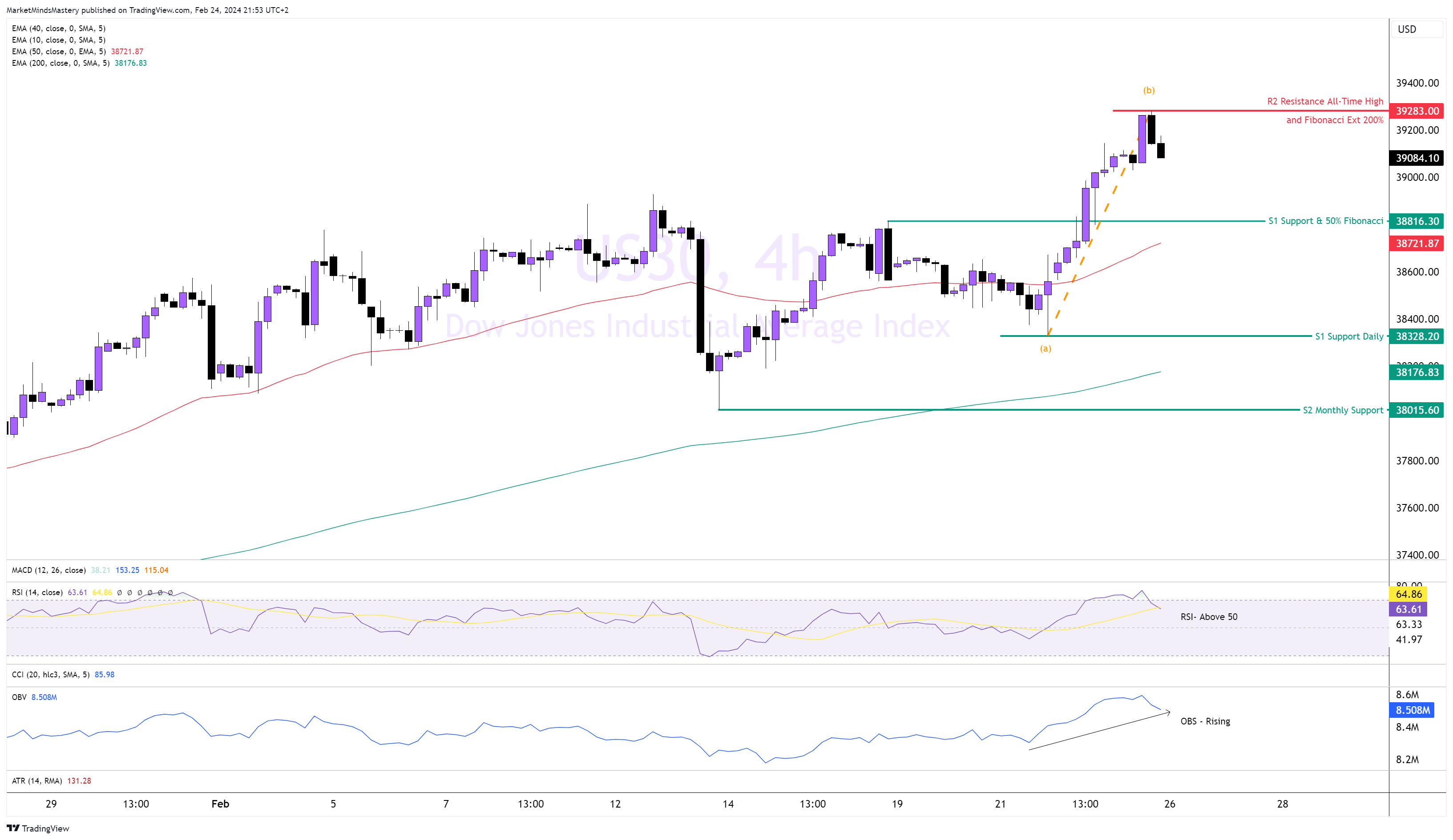 Bei einer Bewegung darüber kann der Kurs ein Allzeithoch erreichen, und wir können runde Zahlen wie 39400, 39500, 39600 usw. verwenden. Fällt der Kurs hingegen und bewegt sich nach unten, liegt der erste Unterstützungsbereich bei 38816, dem jüngsten gebrochenen Swing-Hoch, das auch aus dem 50% Fibonacci-Retracement von Punkt (a) zu Punkt (b) besteht.