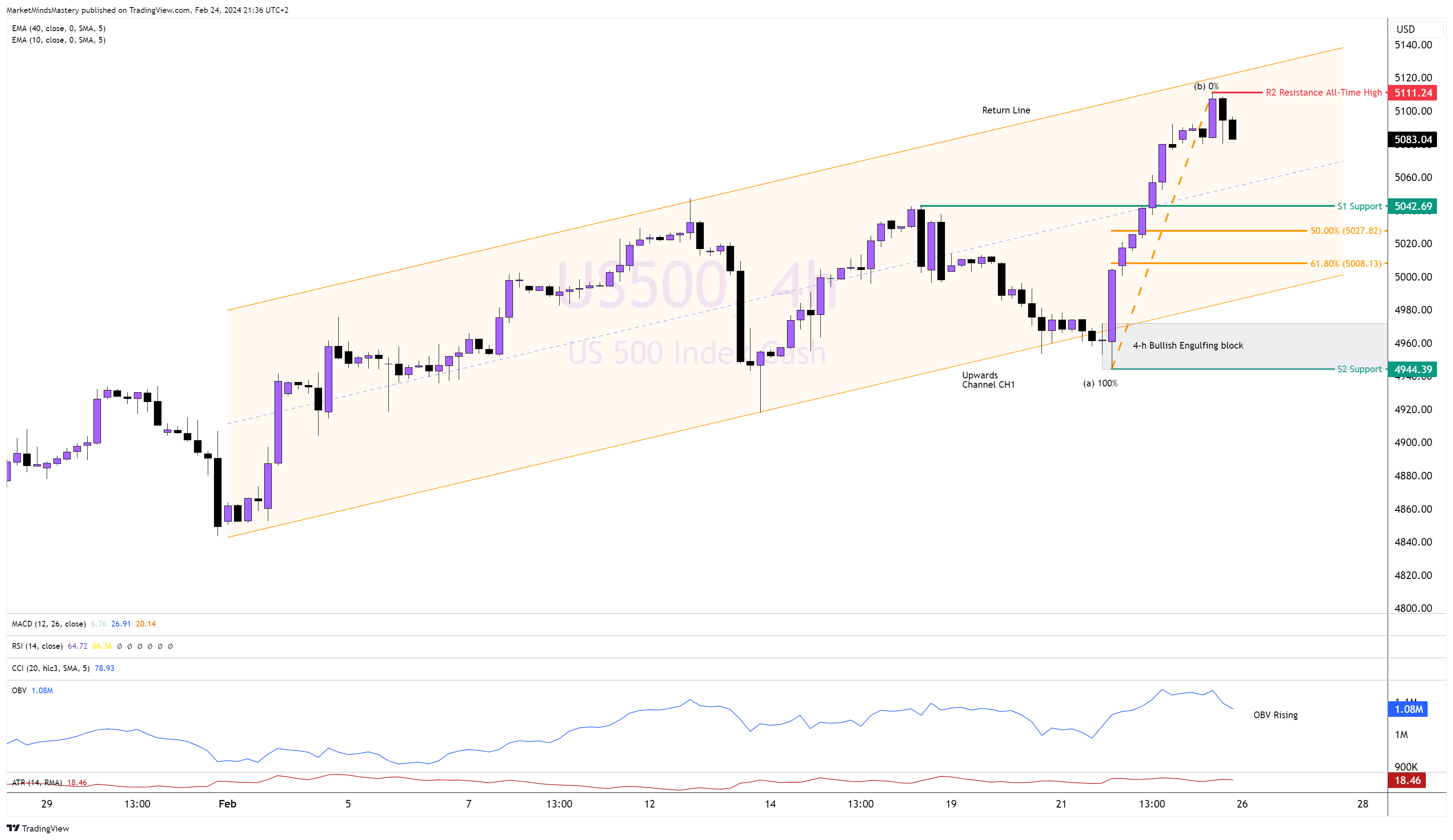 Umgekehrt, wenn der Kurs fällt und sich abwärts bewegt, ist die S1-Unterstützung um 5042 die erste, die wir finden. Dieses Niveau war ein kürzlich gebrochenes Swing-Hoch. Ein weiterer Rückgang kann die 50% und 61,8% Fibonacci-Niveaus um 5027 bzw. 5008 erreichen.