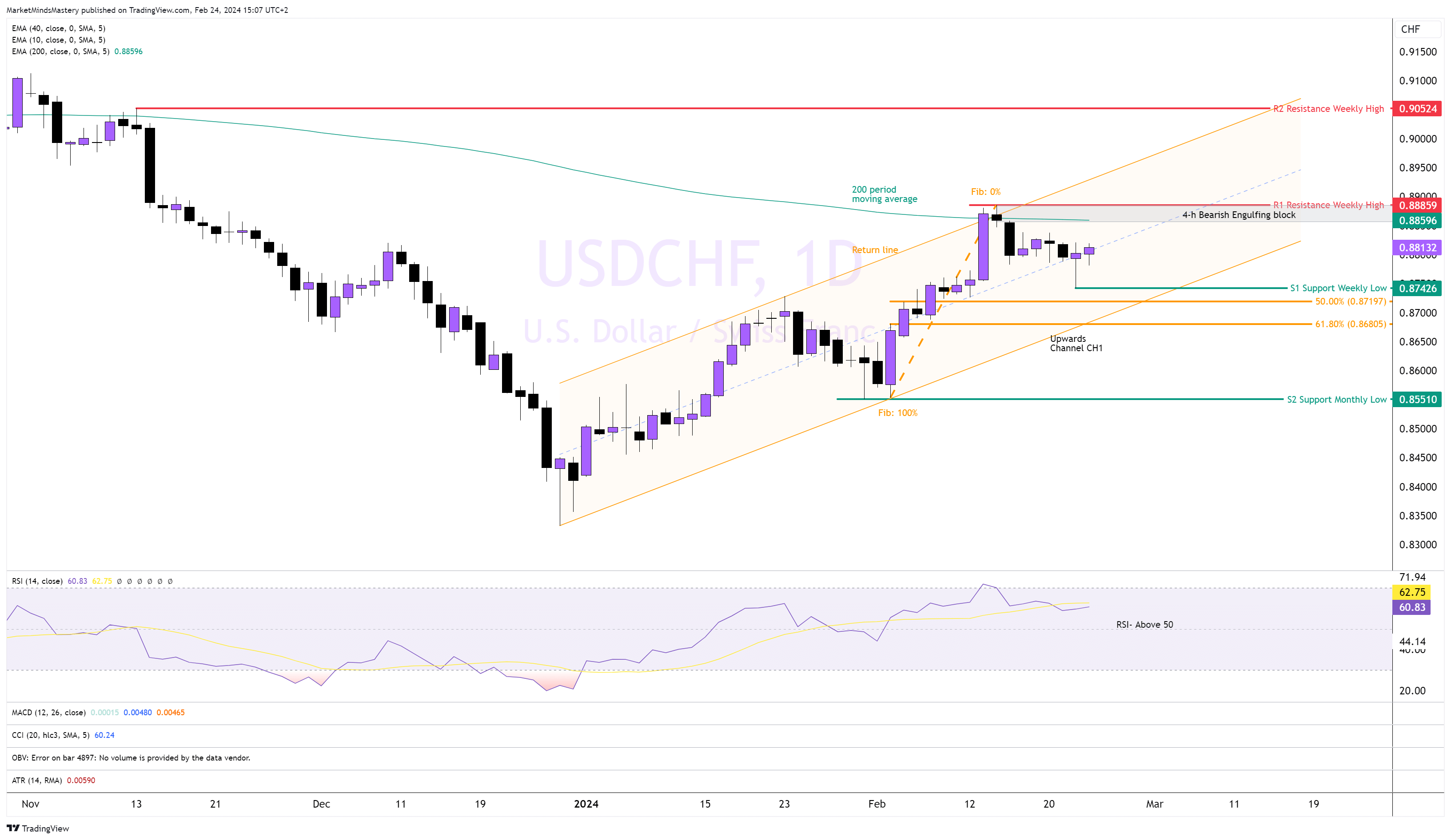 Der Aufwärtskanal, CH1, ist immer noch gültig, da er nicht in den Kurs eingedrungen ist. In der vergangenen Woche handelte der Kurs, wie von uns erläutert, nach oben, und ein Abprallen vom jüngsten Swing-Hoch war bei einer Kurskorrektur möglich. Dies geschah, und gleichzeitig erreichte der Kurs den 4-h bullish engulfing block und prallte letzten Donnerstag nach oben ab, wobei er einen langen Docht hinterließ. Der RSI liegt deutlich über dem Richtwert von 50, und das ist zinsbullisch. Der Preis handelt derzeit um die Mitte des Aufwärtskanals CH1, was ebenfalls zinsbullisch ist.