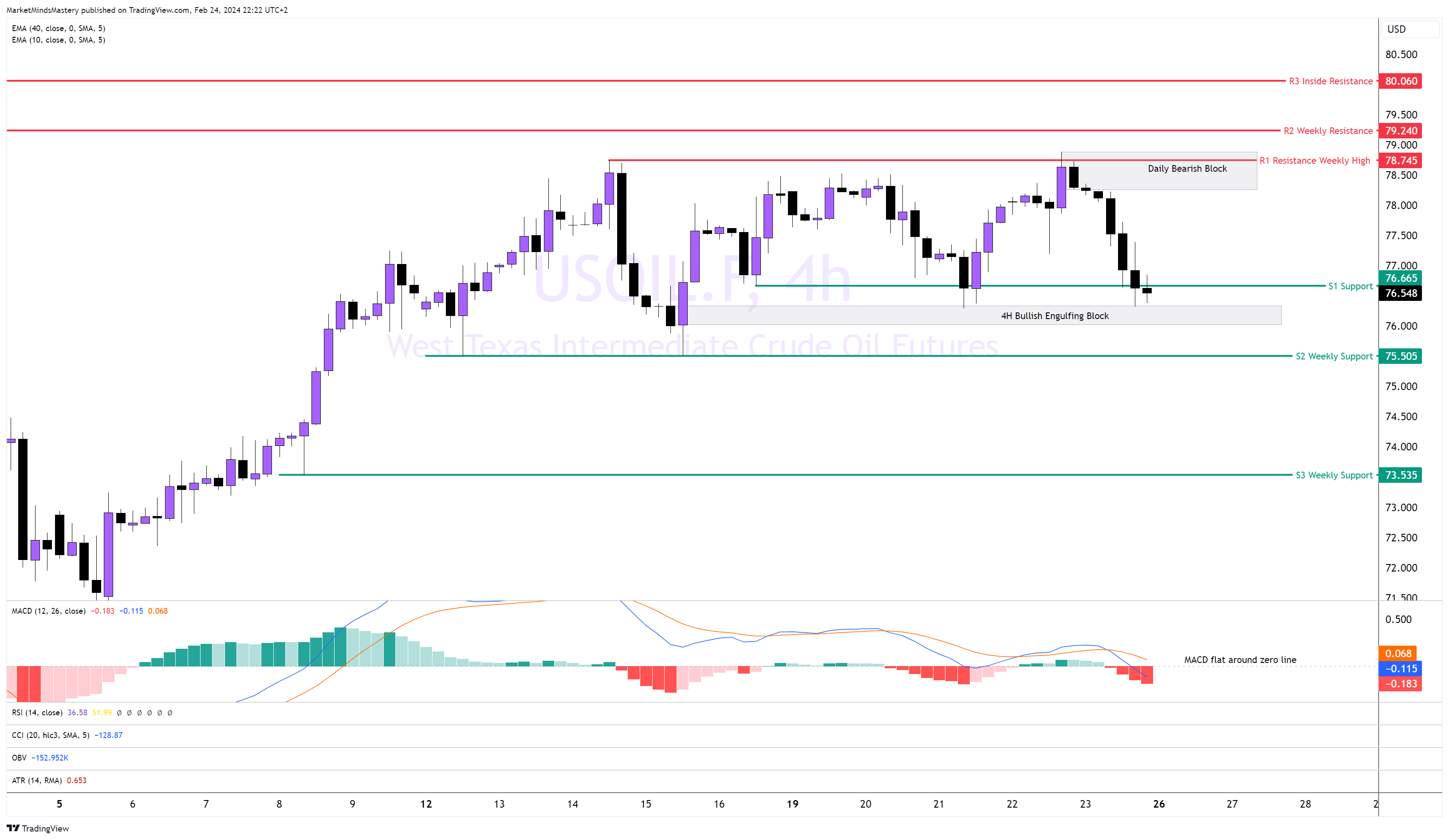 Wenn der Kurs also abprallt und sich nach oben bewegt, ist der erste Widerstandsbereich, R1, das Hoch der letzten Woche, und dort entsteht ein bearish engulfing block aus dem Daily chart. Wenn der Kurs diesen durchbricht und sich nach oben bewegt, kann der R2, der Wochenwiderstand um 79,24, den Kurs zum Stillstand bringen. Jetzt ruht der Preis um die S1 Unterstützung, ungefähr 76,66. Wenn der Kurs diese durchbricht, darunter schließt und den 4-Stunden-Bullish-Engulfing-Block überwindet, liegt die nächste Unterstützung, S2, bei ca. 75,50.