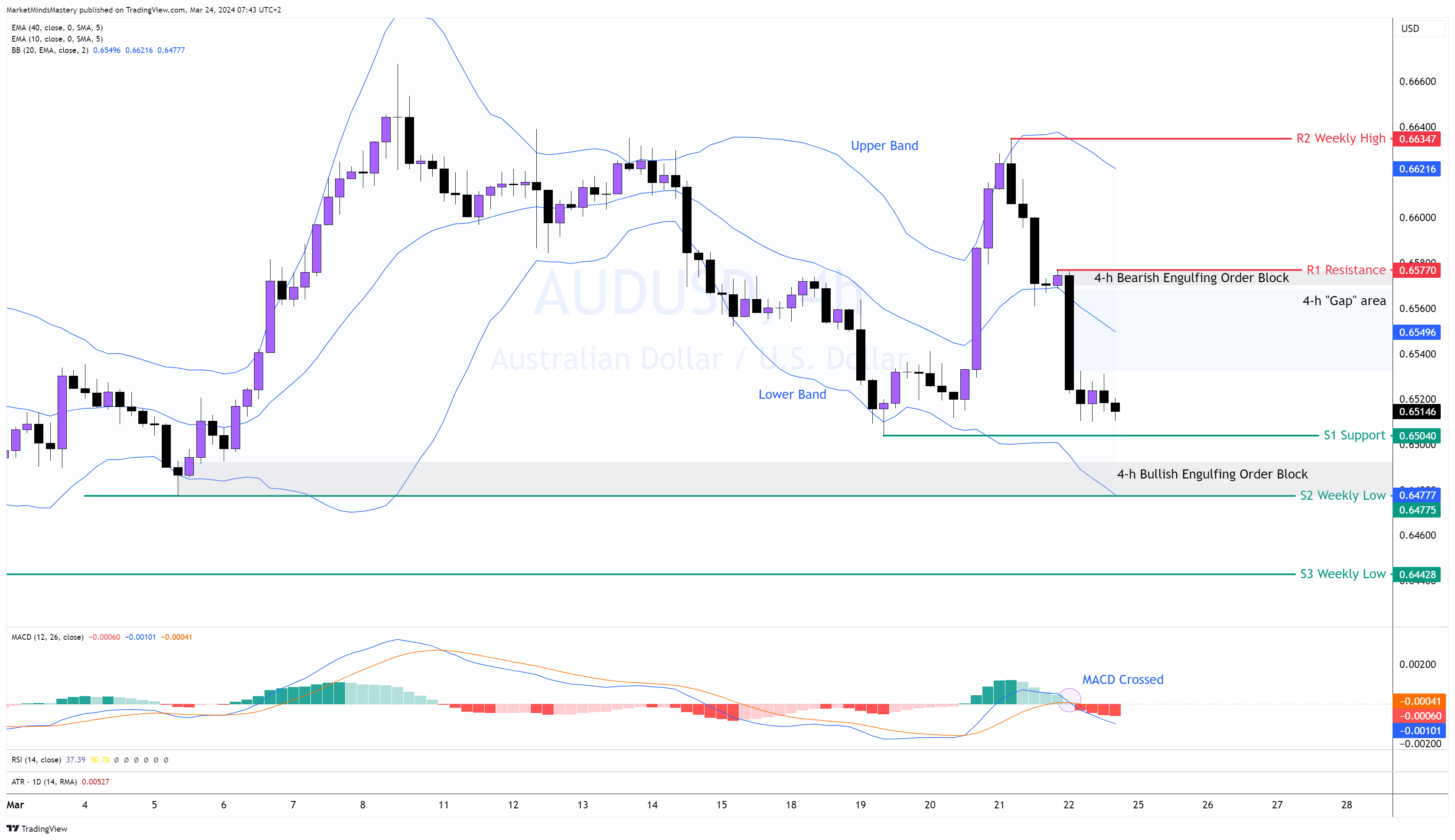 The previous week, the RBA and the FED kept Australian and US Interest Rates unchanged, respectively. Within the same day, the market appreciated the Aussie and created an upward impulsive move and, by the end of the previous week, retraced 100% of the move, moving downwards. On the weekly chart, this price move is shown as a bearish candle with an upper wick rejecting the 10-period and 40-period weekly moving averages. The MACD Line (blue) of the MACD crossed below the Signal line (orange colour) and moved under zero, indicating a bearish market. The price is trading below the middle of the Bollinger Band, which is also a bearish indication. However, the price didn’t make a lower high and lower low formation; therefore, a cautious approach is needed at this stage.