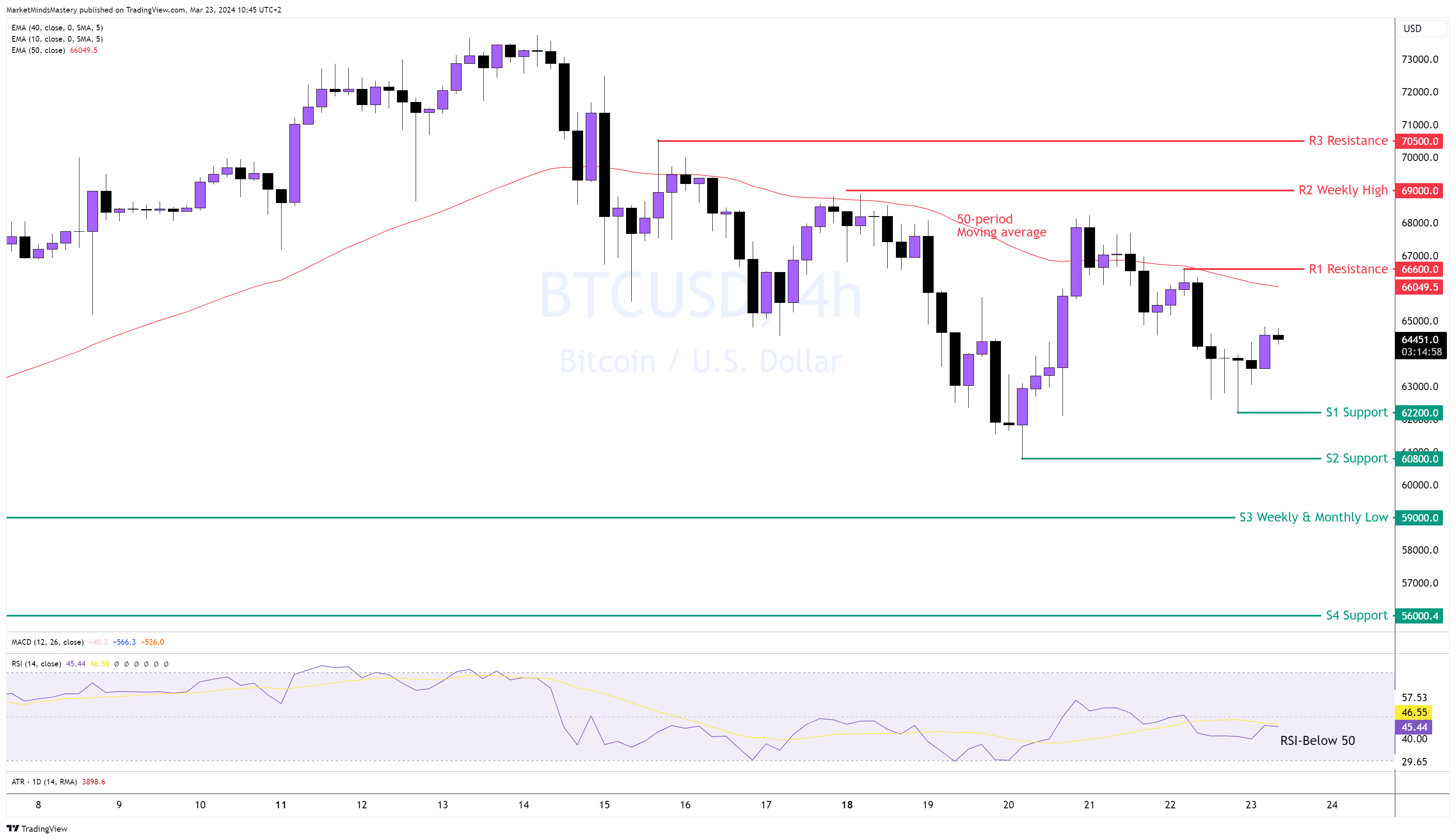 Following the successful bounce off the Bullish engulfing’s Order Block based on last week’s analysis, the price moved away from the area of $61000. The price tried to create a new high above $61000 but failed, and it closed below the 50-period moving average, indicating a bearish bias. Additionally, the price is still under the lower highs and lower lows on the 4-h chart, and the RSI is trading below 50, indicating bearishness. Therefore, if the price continues to move downwards, the S1 support around $62200 will be the first support area. If the price penetrates it and declines further, the next support area, S2, is approximately $60800. If the price decisively penetrates S2 and trades under it, the next support area, S3, is around $59000.