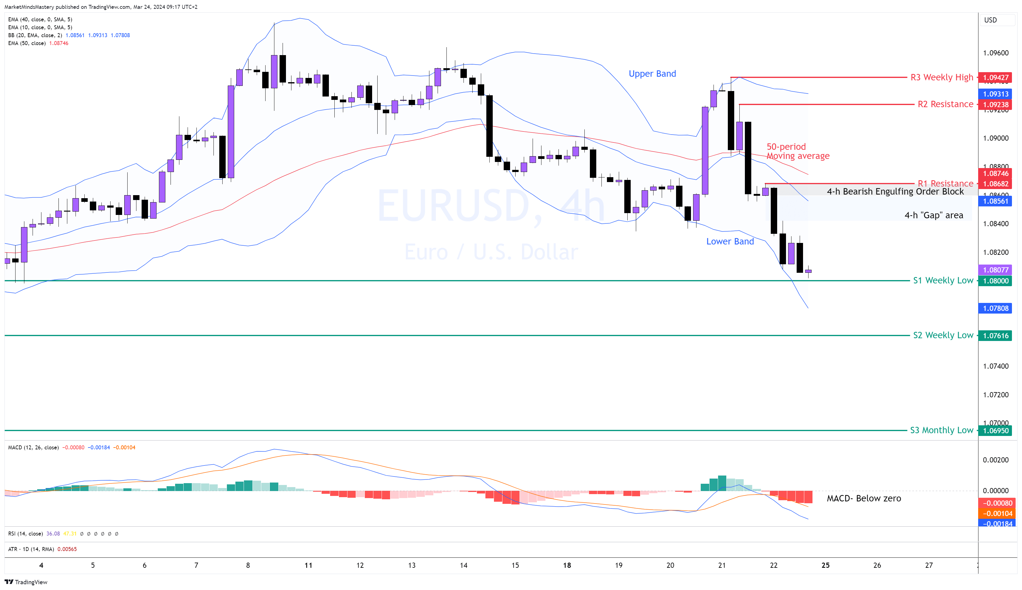 The US dollar’s strength came towards the end of the week even though the Fed kept the interest rates in the US at 5.5%. The price created a lower low and a lower high formation, which shows the shift in the market from buyer to seller and has bearish implications. Additionally, the 20-period moving average (blue line) crossed the 50-period moving average (red line), and the price is trading at the lower band of the Bollinger Bands indicator. Also, the MACD shows bearishness as it moves below the zero line, and the blue line (MACD line) crosses below the orange line (Signal line).