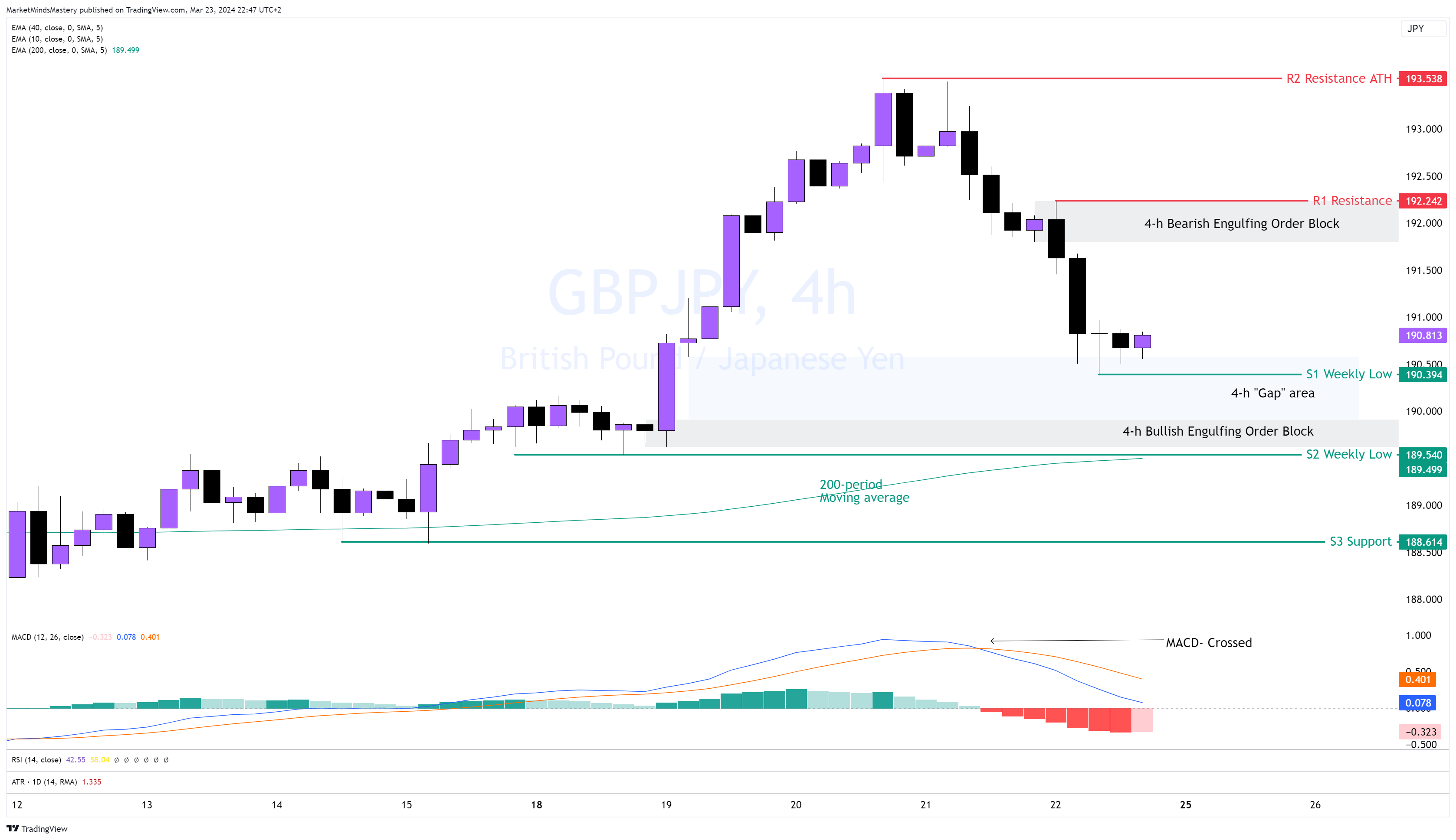 The MACD line has already crossed below the signal line while it is above the zero line, which is a bearish indication. Therefore, if the price declines, the first support area, S1, will be the previous week's low, around 190.39. If the price declines further and closes below the S1, the next support area, S2, will be around 189.54. A level consists of the S2 weekly low, the 4-h Bullish Engulfing Order Block, and the 200-period dynamic moving average. If the price also penetrates the S2, closes below it and moves downwards, the next support, S3, is around 188.61.