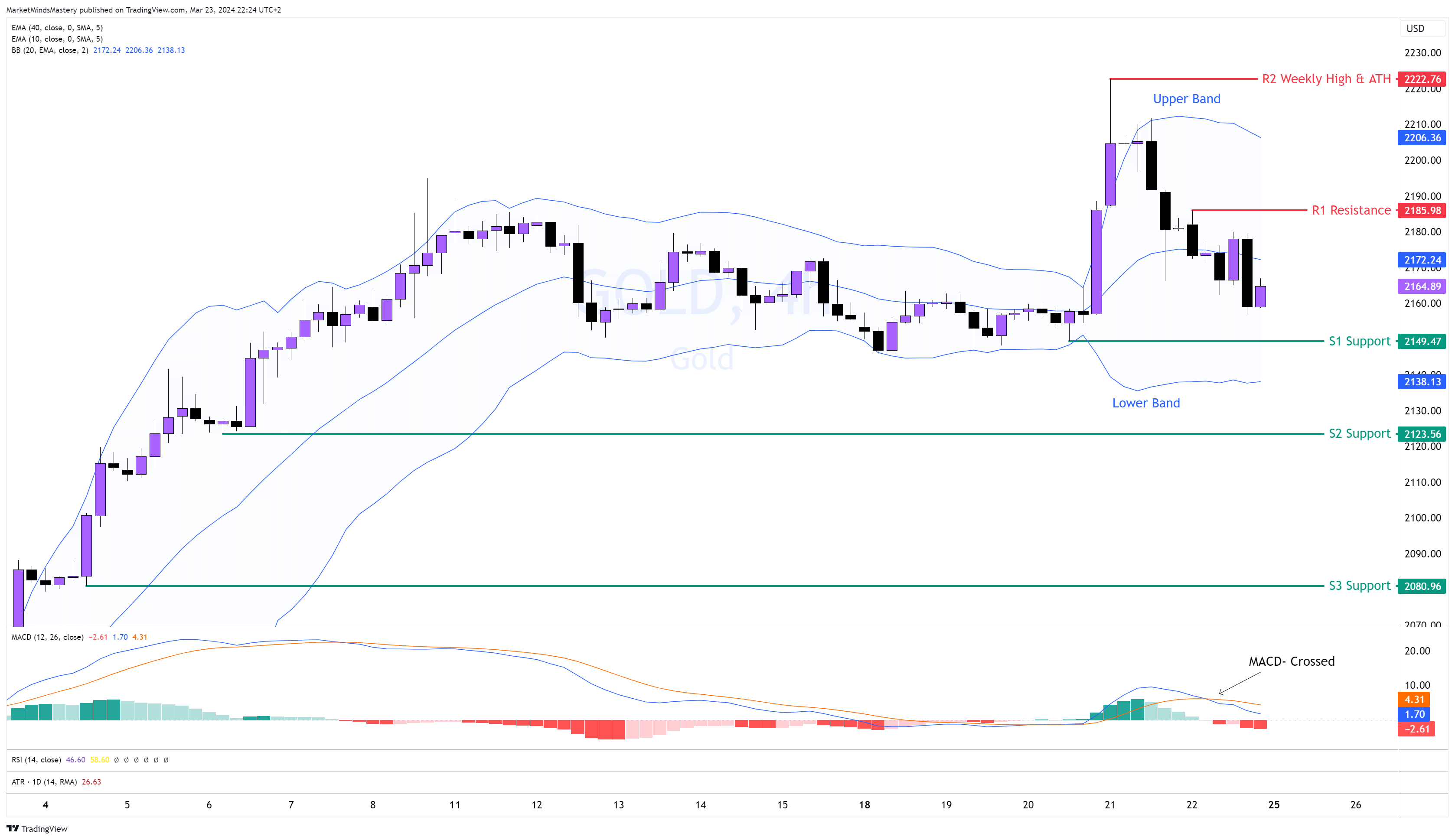 The MACD crossed above the zero line, which is a bearish indication. The Upper and Lower Bands move parallel, indicating a market in equilibrium, with the current price trading below the 20-period moving average. Therefore, if the price continues falling, the first support, S1, is approximately $2149. If the price closes under S1 and moves downwards, the next support area, S2, is roughly $2123.