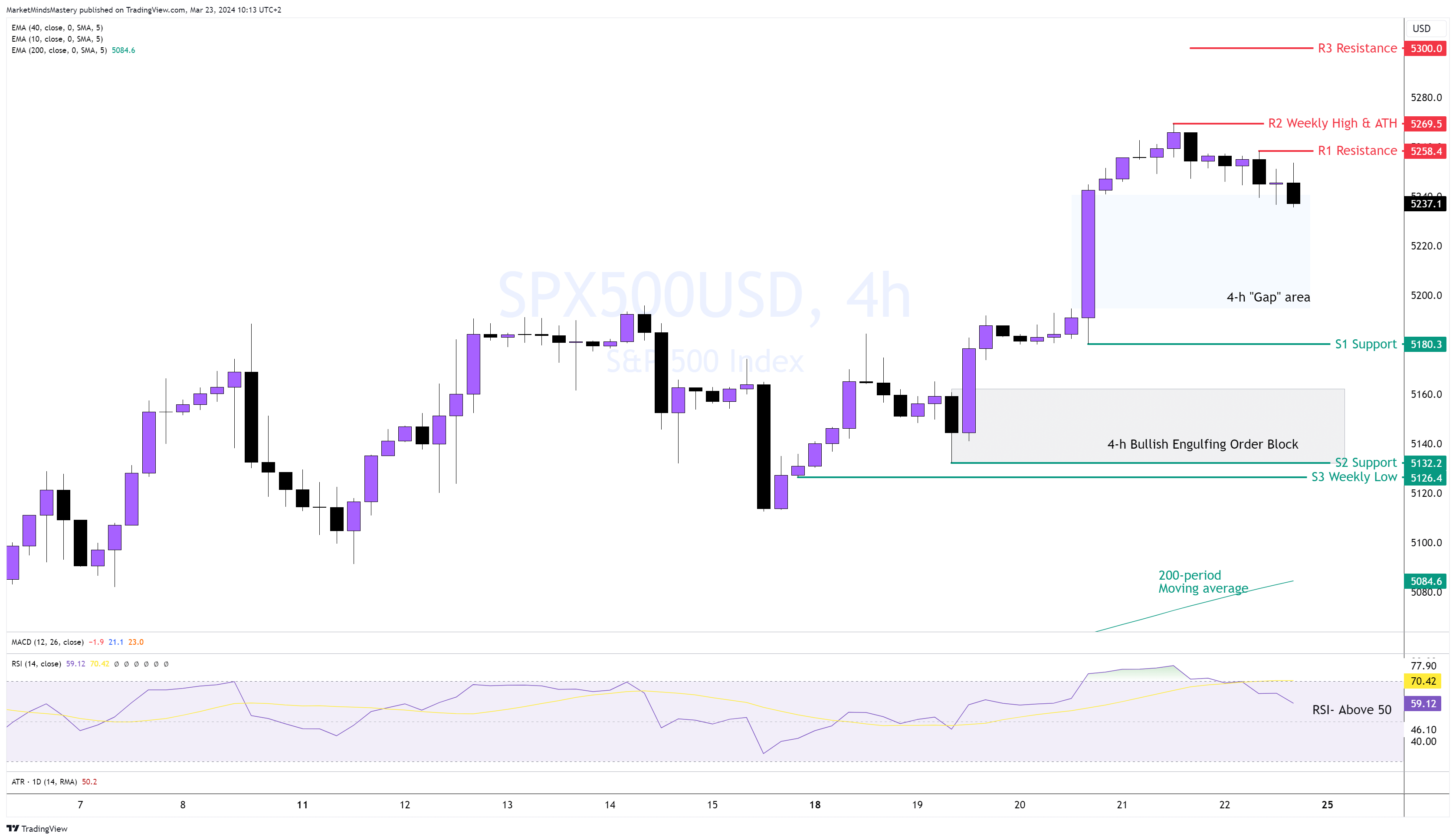 The RSI oscillator's above 50 indicates a bullish market. The price is well above the 200-period moving average, which is also a strong bullish indication. The price entered a corrective phase toward the 4-h “Gap”. If the price continues to move downwards, the S1 support is the first area in the price that may be tested. If the price breaks below the S1 and declines further, it will enter into the well-defined 4-h Bullish Engulfing Order Block resting at the S2 support, which almost aligns with the S3 previous week’s low. Conversely, if the price moves upwards, the first resistance area, R1, is approximately 5258. A further upward move will find the price re-testing the R2, last week’s high, around 5269. An attempt for a new ATH(All-Time High) can lead to round 5300.