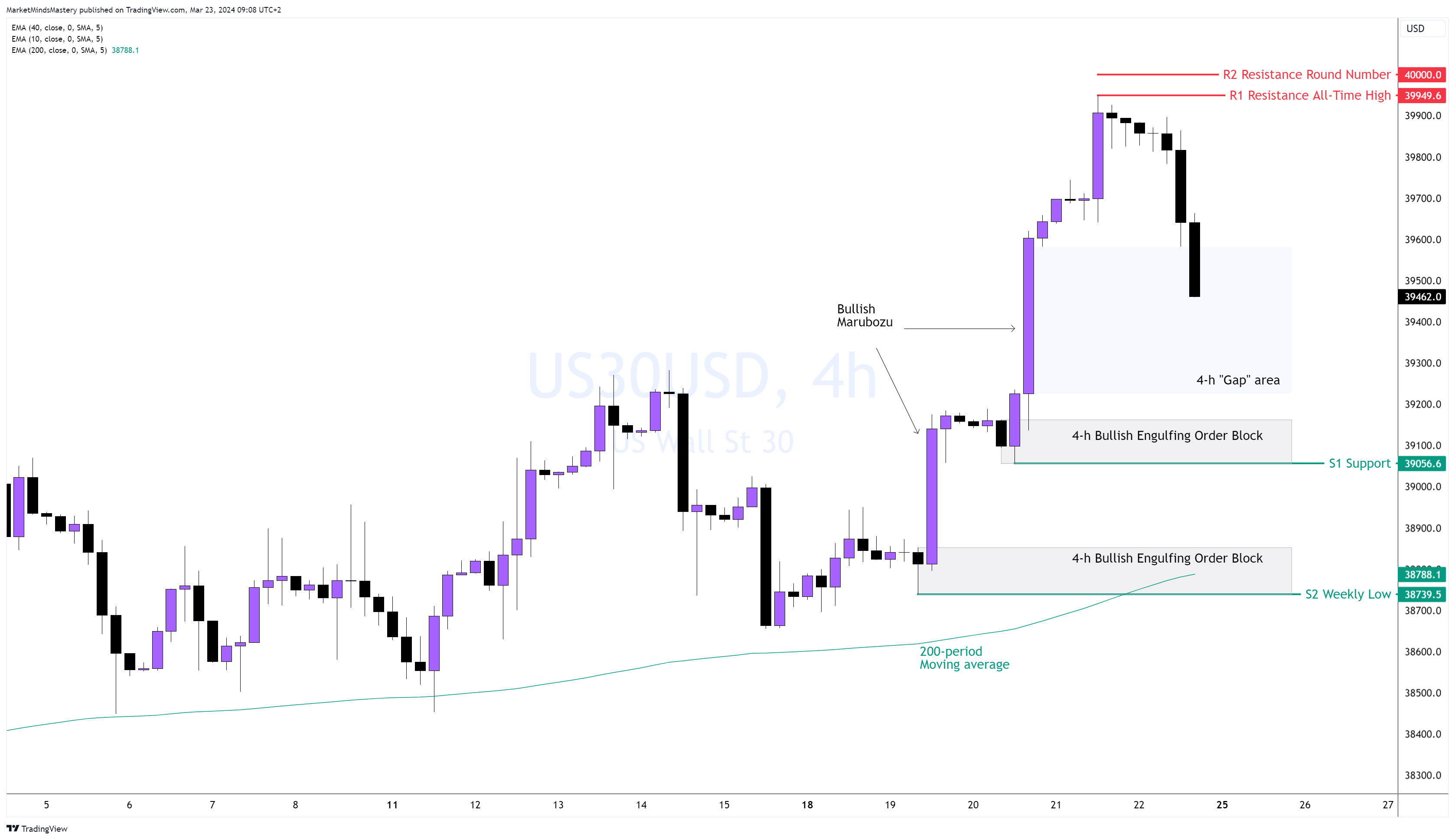 The price is above the 200-period moving average, which is a bullish indication, and the RSI oscillator is above 50, which is also a bullish indication. Currently, the price trades within the 4-h “Gap” area. Suppose the price declines further to fill all the “Gap”. The first support area, S1, was founded around 39056. A Bullish Engulfing Order Block is resting at this level and hasn't been tested yet. If the price decisively penetrates the S1 and moves under it, the next support area, S2, is last week’s low, approximately 38788. At this level, there is a cluster of a Bullish Order Block and the 200-period moving average.