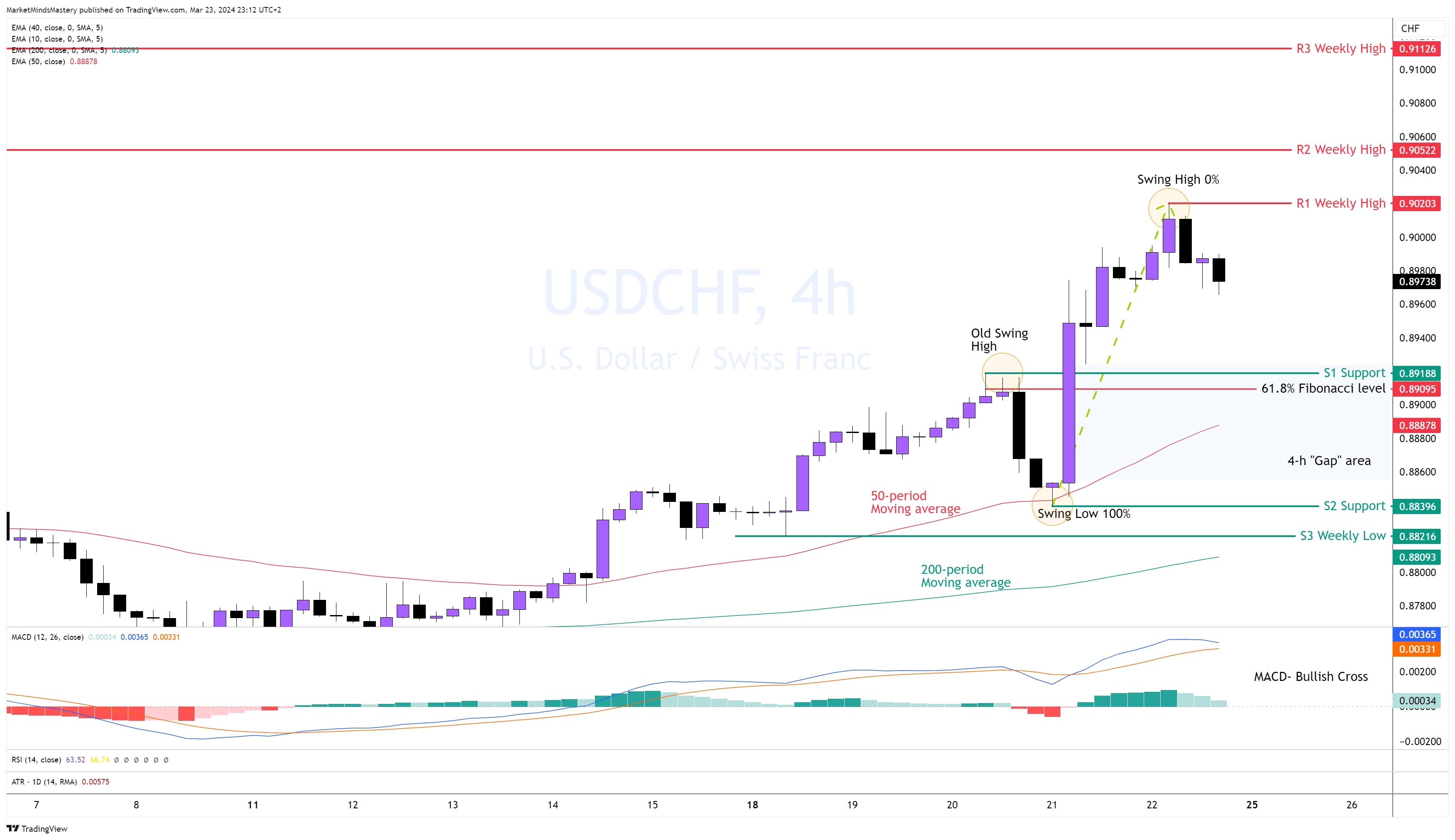 The Interest Rate drop in Switzerland helped the USD CHF to climb higher and create a robust, impulsive upward move. The price made a higher high and higher low formation, indicating a bullish market. The MACD line crossed above the signal line, and they are above zero, indicating a bullish market. The 50-period is above the 200-period moving average, indicating a strong bullish market. The price entered a corrective phase, as per the minor break of market structure, and if it continues to move downwards, the first support area, S1, will be around 0.89188.