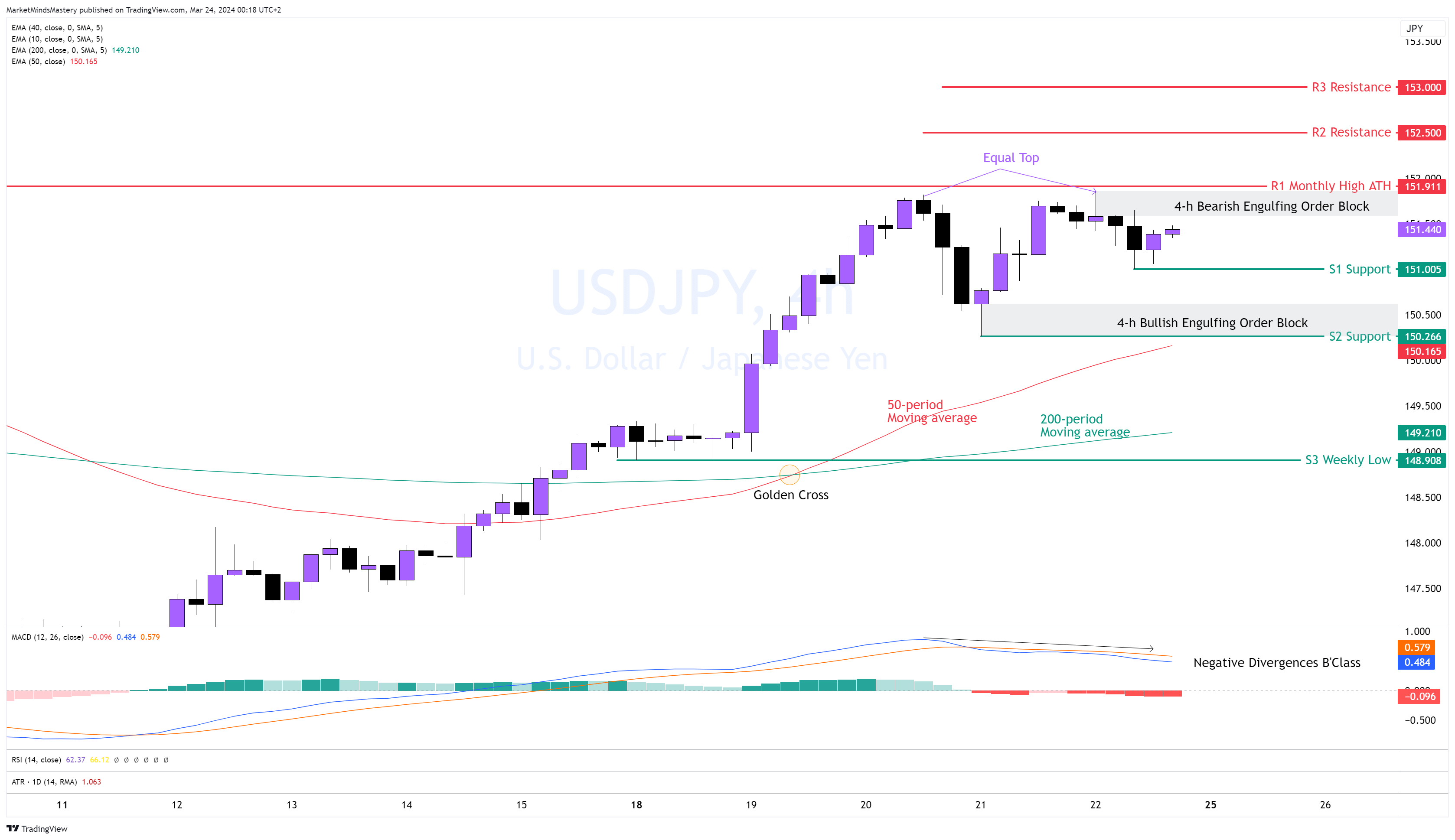 The price action at the end of the previous week created an Equal High (not a Double Top yet) formation last Friday. The significance is the formation's price level falsely breaks above the ATH. The price was rejected and moved away from the level. The MACD printed Negative Divergences B’class while the price tried for a new ATH, indicating that the price could enter into a corrective phase. As the 50-period is above the 200-period moving average, indicating a bullish market, and the price didn't create a downtrend, we can only assume a price retracement at this stage. If the price moves downwards, the first support, S1, is the area around 151.