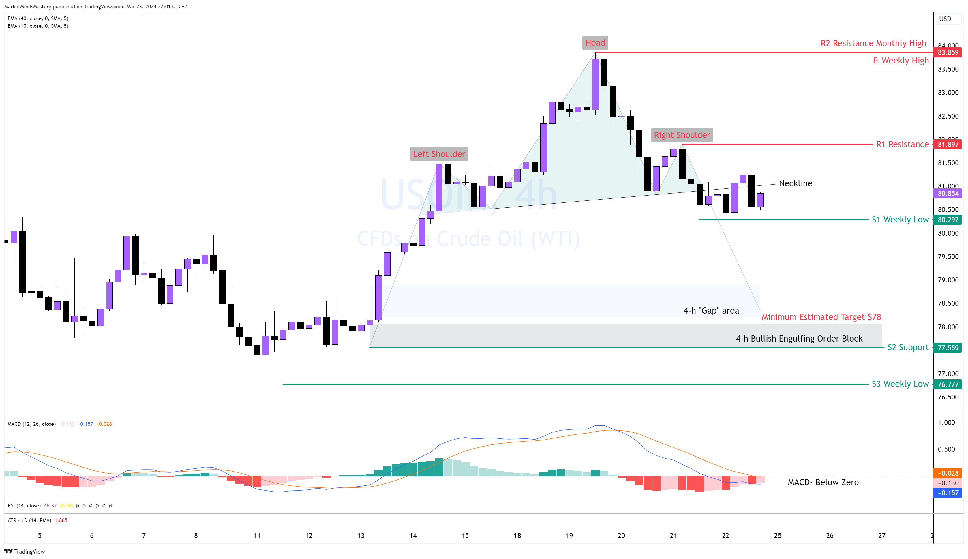 Following the upward move, the US OIl on the 4H chart reached the Monthly high of around $83.57 and declined. The Weekly chart formed a Gravestone Doji Price Action while rejecting the monthly resistance. As per the candlesticks patterns, it has bearish implications. The MACD crossed below the zero line, which also indicated bearishness. The 4-h chart created a Head and Shoulder reversal pattern with bearish implications. All traders need to pay attention to signs of failure of the H&S. If accumulation builds around the S1 weekly low and the price doesn’t break on a heavy volume below the S1, the pattern may fail.