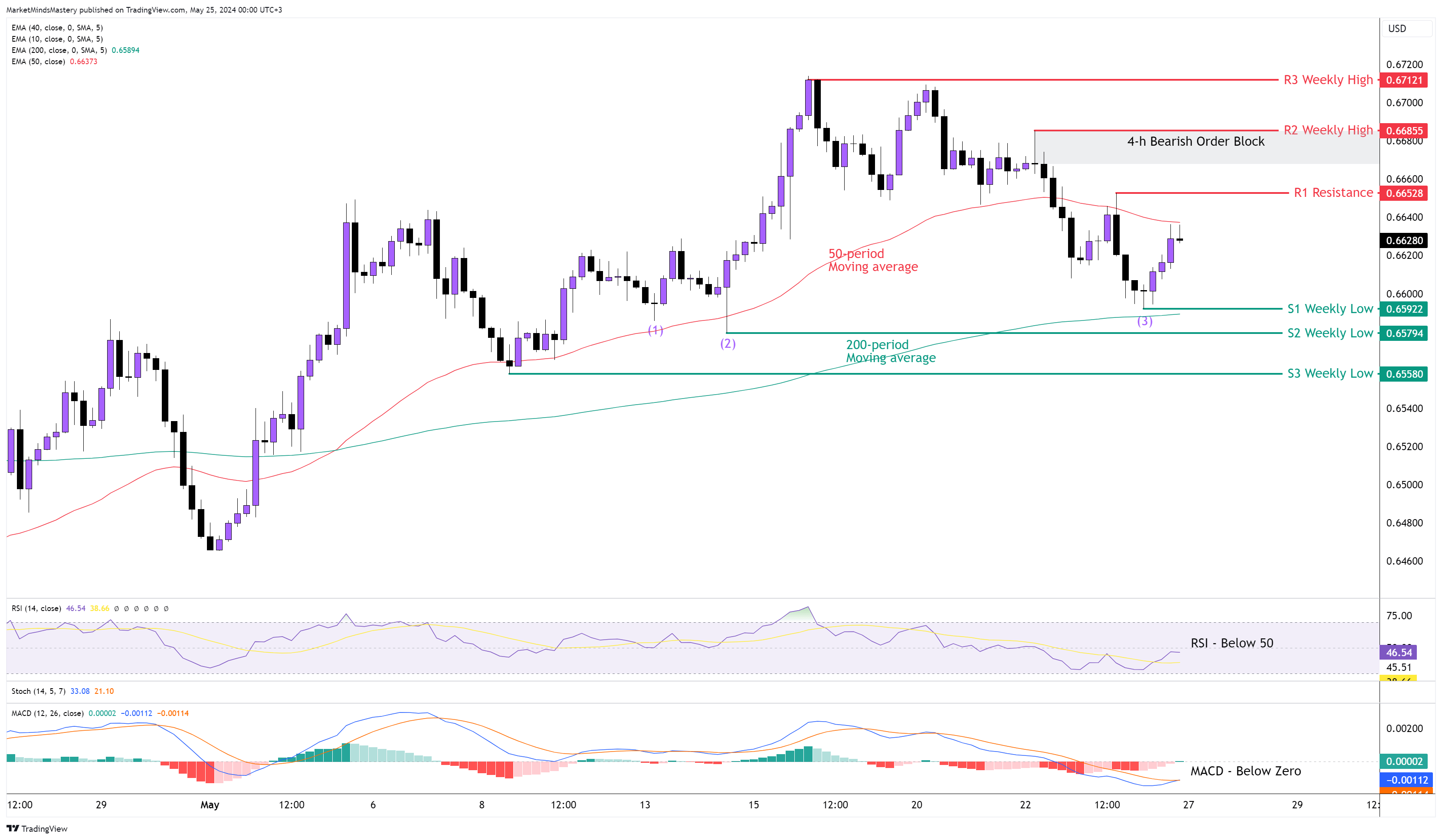 D'altra parte, se il prezzo si muove verso l'alto, la prima resistenza, R1, si trova intorno a 0,66528. Se il prezzo penetra in R1 e si muove verso l'alto, la prossima resistenza, R2, è il massimo della settimana precedente, intorno a 0,66855. Una candela Gravestone ha causato il declino del prezzo la scorsa settimana, lasciando dietro di sé un blocco d'ordine ribassista.