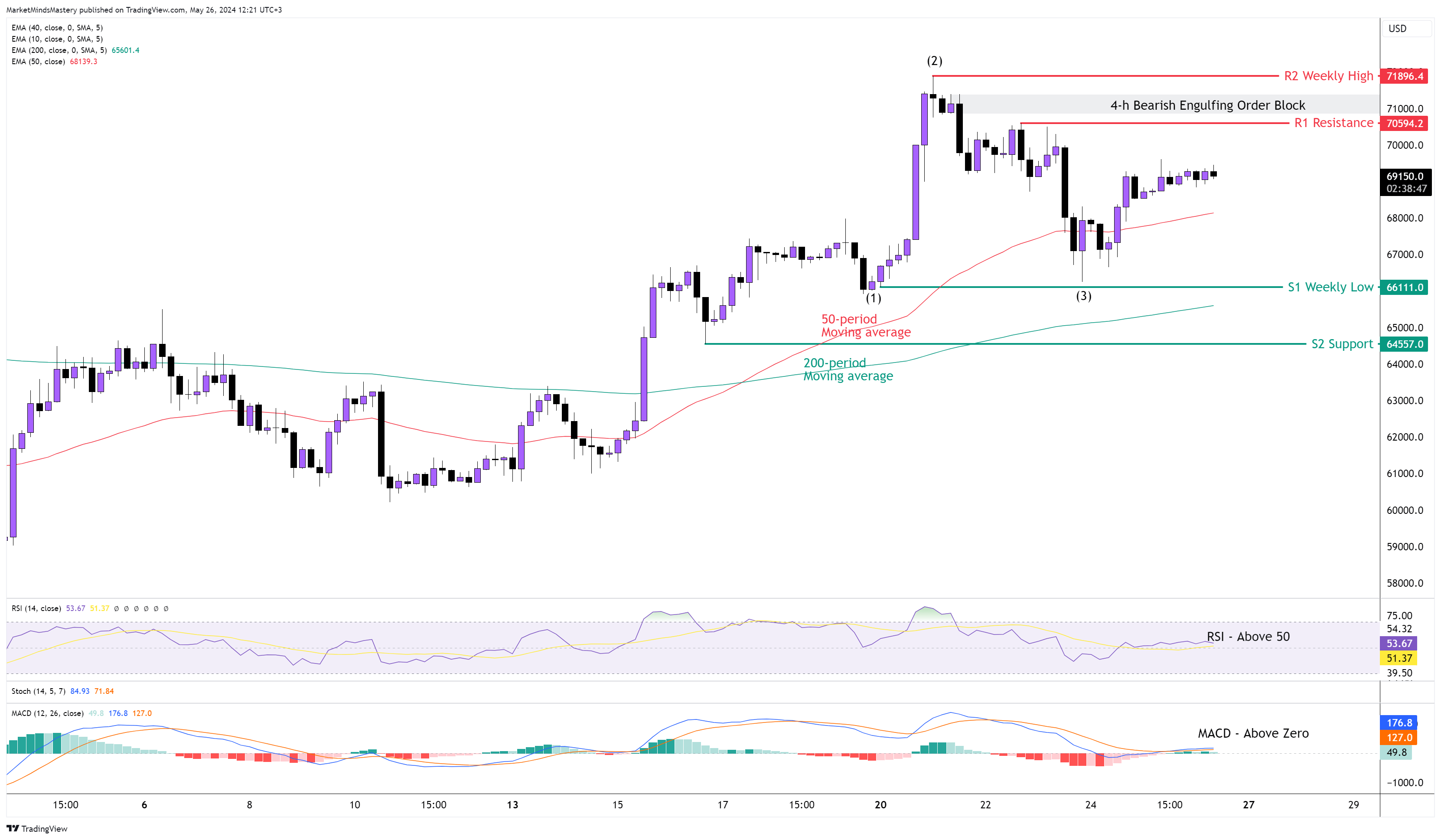 L'entusiasmo tra i trader e gli investitori è la forza principale dietro lo slancio al rialzo delle criptovalute. Con il Bitcoin in testa per volume e prezzo, il mercato, per un'altra settimana, si è impennato e ha creato un massimo e un minimo più alti sul grafico a 4 ore. Attualmente, i prezzi in aumento mantengono la media mobile a 50 periodi al di sopra della media mobile a 200 periodi. L'oscillatore RSI è al di sopra di 50, una chiara indicazione di una tendenza al rialzo. Il MACD è al di sopra della linea dello zero e questo ha implicazioni rialziste. Il cornetto della MACD Line (blu) al di sopra della Signal Line (arancione), che l'indicatore scambia sopra lo zero, conferma il trend rialzista del mercato. L'oscillazione al punto (3) ha quasi scambiato allo stesso livello del punto (1), indicando una sorta di debolezza del mercato. Da lunedì, se il prezzo continuerà a salire, la prima area di resistenza, R1, sarà 70594 dollari, un livello testato due volte la scorsa settimana. Se il prezzo penetra l'R1 e si muove più in alto, la prossima area di resistenza, R2, è intorno ai 71896 dollari. Si tratta del prezzo più alto della settimana precedente e di un'area con un Bearish engulfing Order Block.