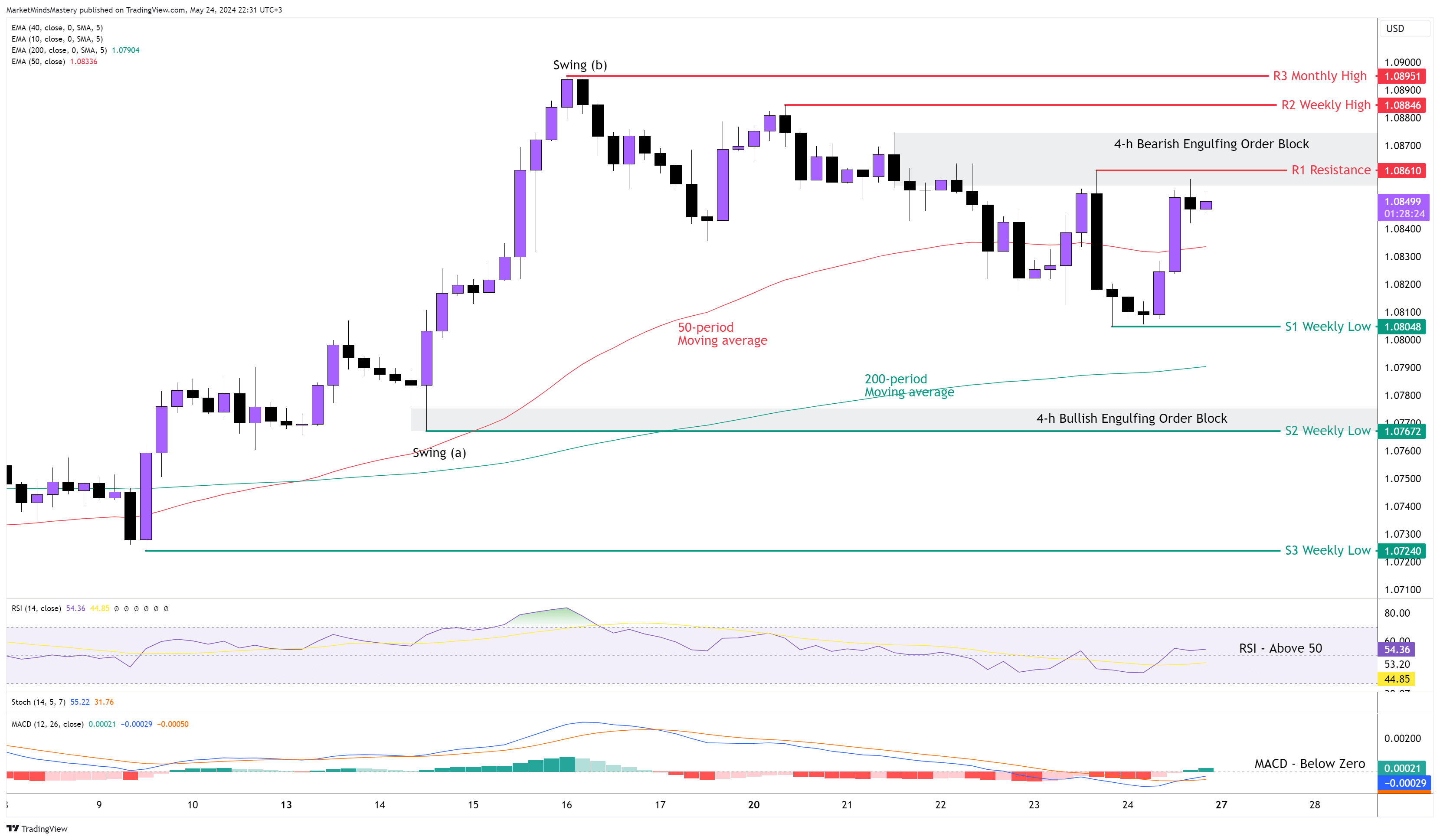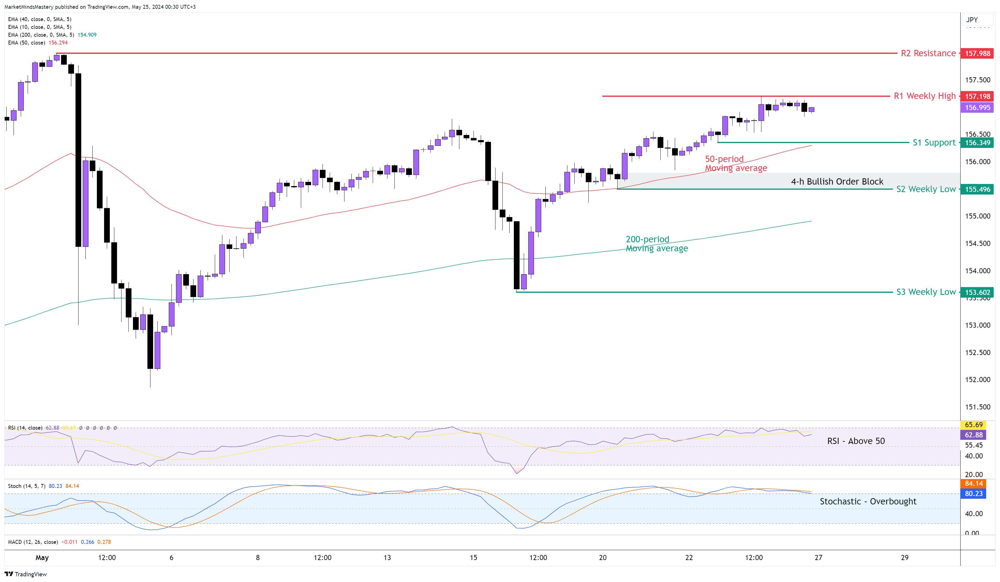 D'altra parte, se il prezzo viene respinto e si muove verso il basso, la prima area di supporto, S1, dovrebbe trovarsi al livello 156,349. Questo è un swing low e dovrebbe trattenere il prezzo in una fase di ribasso se la tendenza al rialzo continua. Si tratta di un swing low e ci si aspetta che tenga il prezzo in discesa se il trend rialzista continua. Se il prezzo rompe e chiude sotto il livello S1, la prossima area di supporto, S2, sarà il minimo della settimana precedente, intorno a 155,500, con un Bullish Order Block formato la scorsa settimana. Un ulteriore calo può portare il prezzo alla media mobile dinamica a 200 periodi.