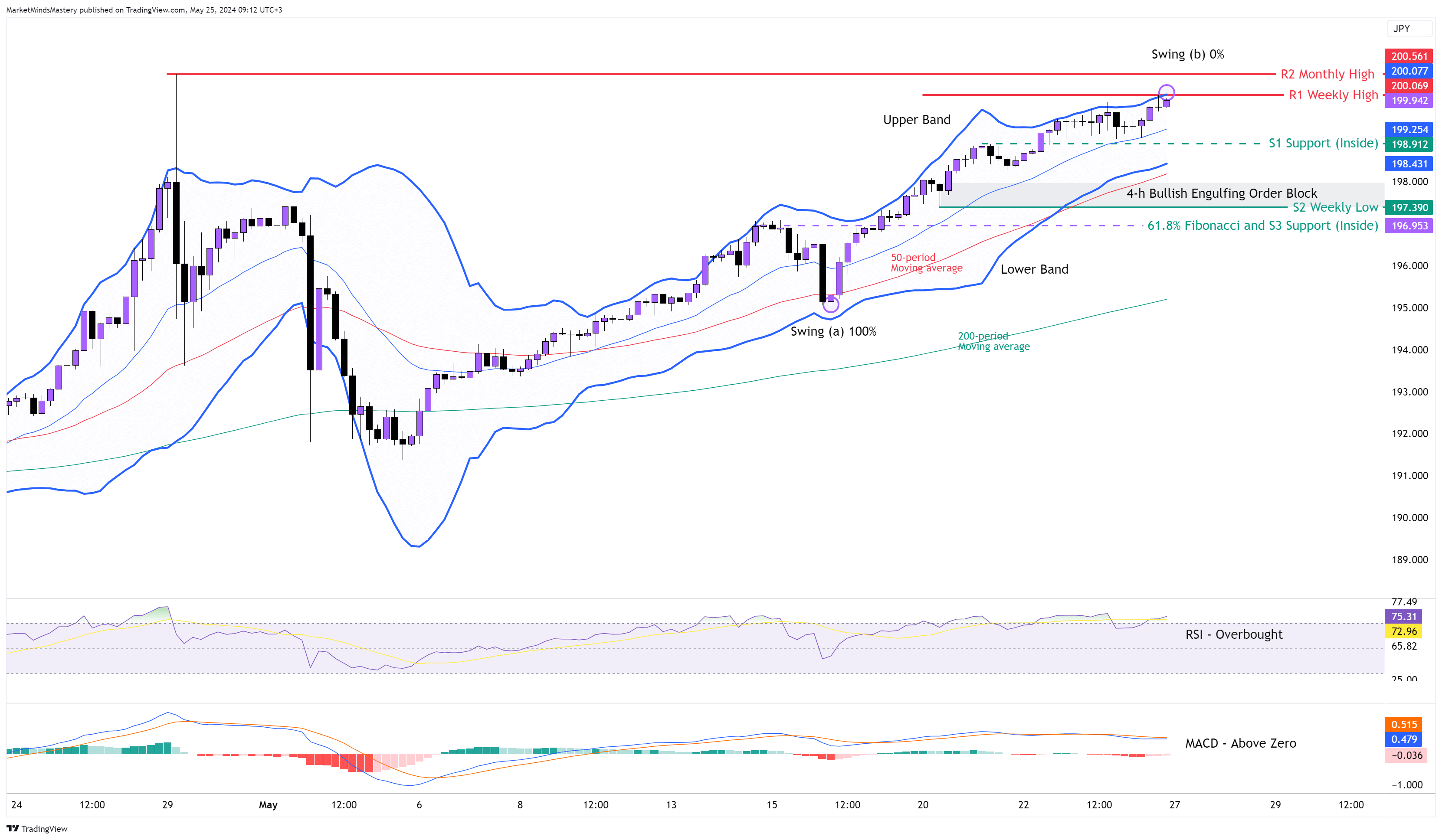 D'altra parte, se il prezzo viene respinto e si muove verso il basso, la prima area di supporto, S1, è un supporto interno intorno a 198,91. Se il prezzo chiude sotto S1 e si muove verso il basso, la prossima area di supporto, S2, è il minimo della settimana precedente, intorno a 197,39. A questo livello si è formato un Bullish Engulfing Order Block.
