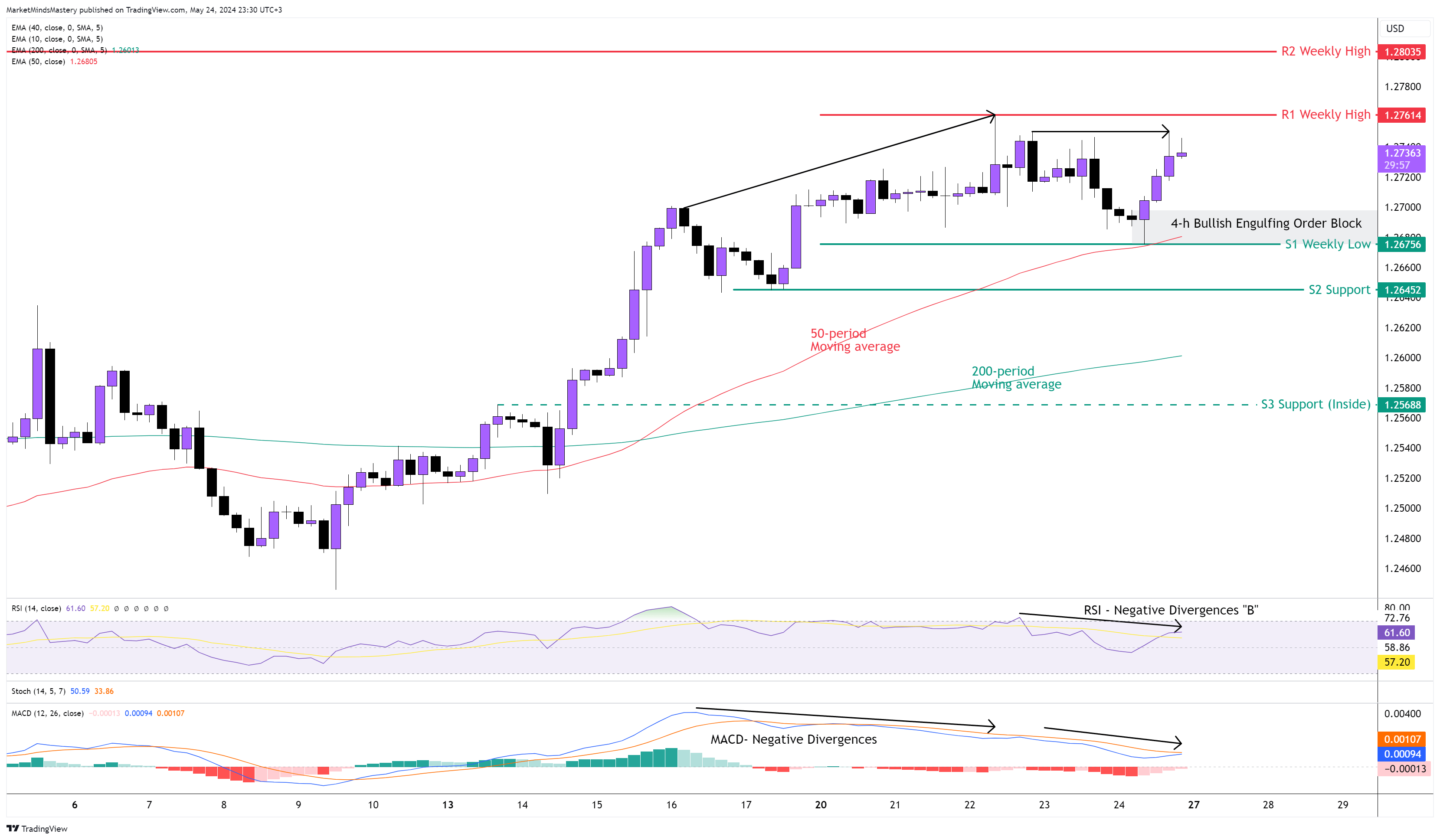 A questo livello, la scorsa settimana si è formato un Order Block rialzista. Inoltre, l'interazione della media mobile a 50 periodi può aggiungere un'ulteriore convalida. Se il prezzo non rimbalza e scende, la prossima area di supporto, S2, sarà intorno a 1,26452. Un ulteriore movimento al ribasso cambierà la struttura del mercato e il supporto S3 sarà intorno a 1,25688. Se il prezzo si muove verso l'alto, il massimo della settimana precedente sarà considerato come la prima resistenza, R1, circa a 1,27614, e la resistenza successiva, R2, circa a 1,28035. Entrambi questi livelli di resistenza sono massimi settimanali.