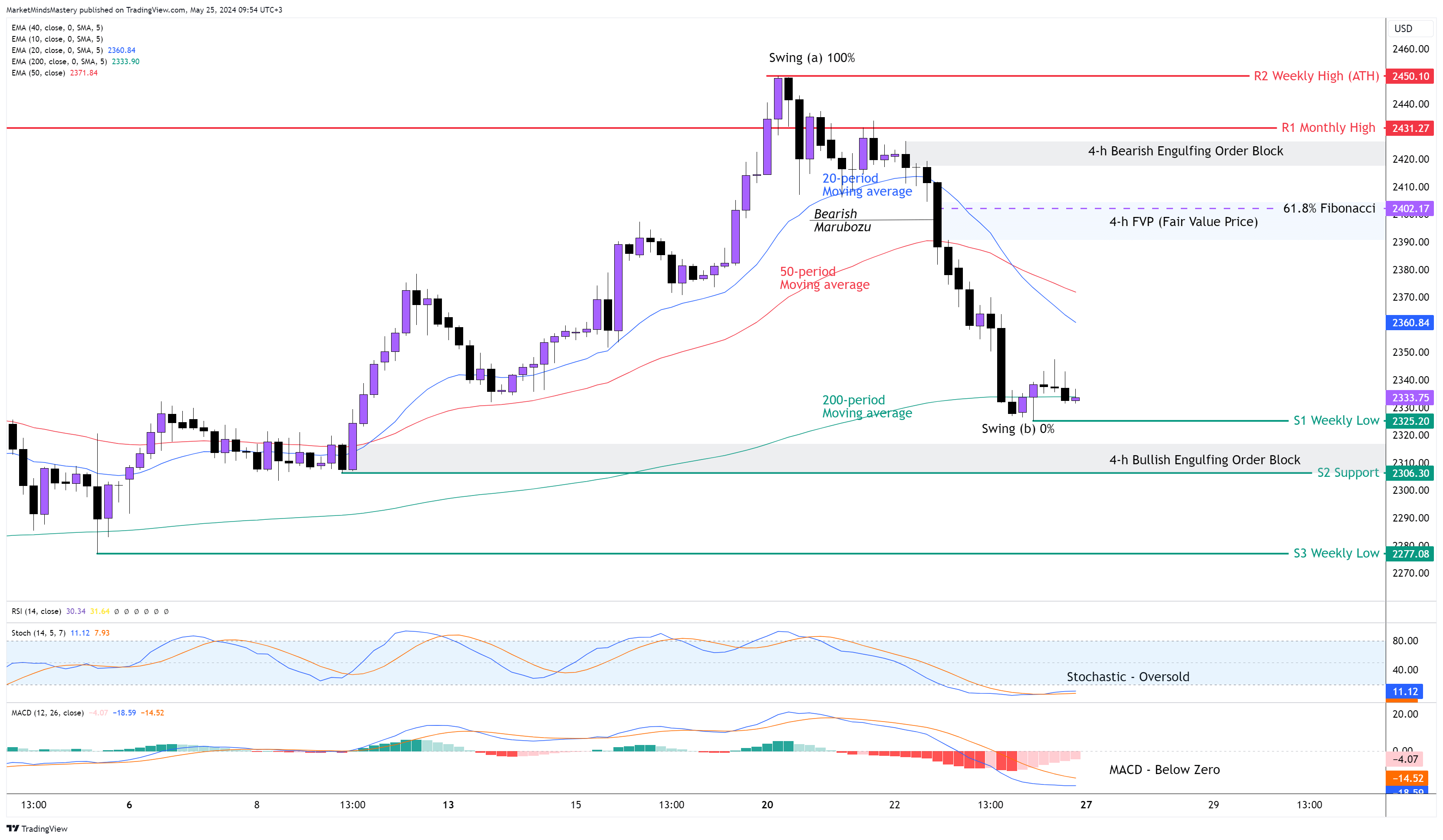 A seguito delle prospettive di mercato della scorsa settimana, il prezzo ha interagito con la resistenza settimanale e ha creato un False Break out. Il prezzo ha segnato un nuovo massimo storico (ATH) a circa 2450 dollari. Il FOMC di mercoledì scorso ha alimentato il declino dell'ORO e il mercato ha creato una tendenza al ribasso sul grafico a 4 ore. Il periodo di 20 periodi ha attraversato sotto la media mobile di 50 periodi , che è un segnale ribassista. Il prezzo ha contemporaneamente realizzato una candela Bearish Marubozu e un Fair Value Price (FVP). MACD a muoversi sotto lo zero, che è un'indicazione ribassista. Inoltre, l'oscillatore Stocastico è in una condizione di ipervenduto, indicando una forte tendenza al ribasso. Attualmente, il prezzo è scambiato con la media mobile a 200 periodi, creando il primo swing low (b). Se il prezzo continua a muoversi verso il basso, il minimo della settimana precedente, S1, sarà la prima area di supporto, intorno a 232 dollari. Se il prezzo penetra in S1 e si muove più in basso, la prossima area di supporto, S2, sarà quella dei 2306 dollari. Un ben definito Bullish Engulfing Order Block può temporaneamente fungere da barriera per il prezzo.