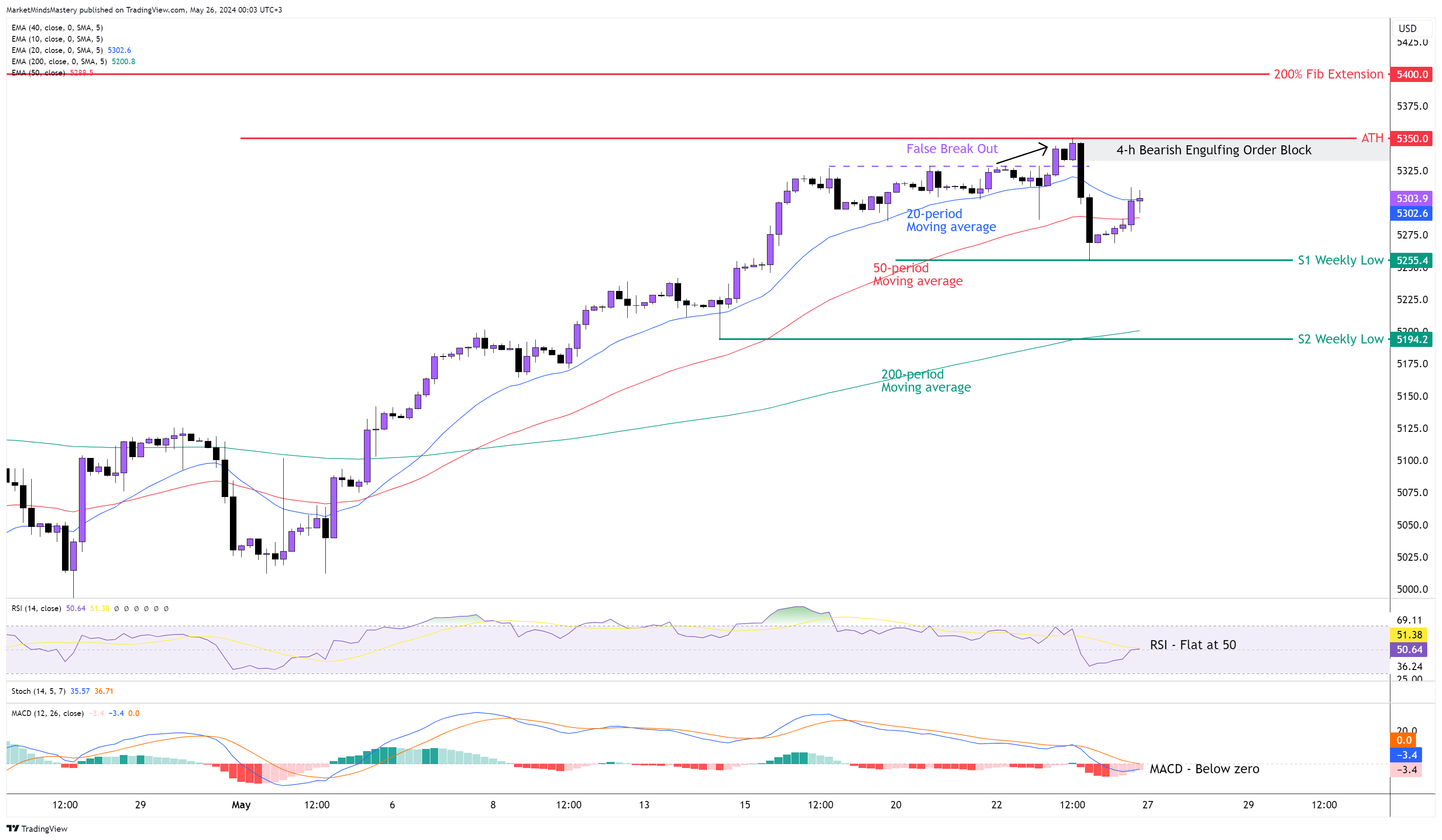 La tendenza primaria al rialzo dell'SP 500 continua e la settimana scorsa il mercato ha chiuso con un nuovo All-Time High (ATH) intorno a 5350 dollari. Si tratta di un prezzo significativo per l'indice, nonostante la candela settimanale creata la scorsa settimana fosse una doji. Una candela doji non è considerata un'inversione di prezzo nell'analisi dei candeli. Tuttavia, quando viene individuata dopo alcune candele rialziste, di solito dà inizio alla correzione dei prezzi. Sul grafico a 4 ore, il prezzo ha mostrato un forte sell-off giovedì durante la sessione di trading di New York con le due lunghe candele nere. Nonostante ciò, la media mobile a 20 periodi è al di sopra di quella a 50 periodi, ed entrambe sono al di sopra della media mobile a 200 periodi. Questa configurazione indica che la tendenza è al rialzo. Poiché il prezzo non ha creato la struttura di massimi e minimi inferiori, non possiamo definire una tendenza al ribasso.