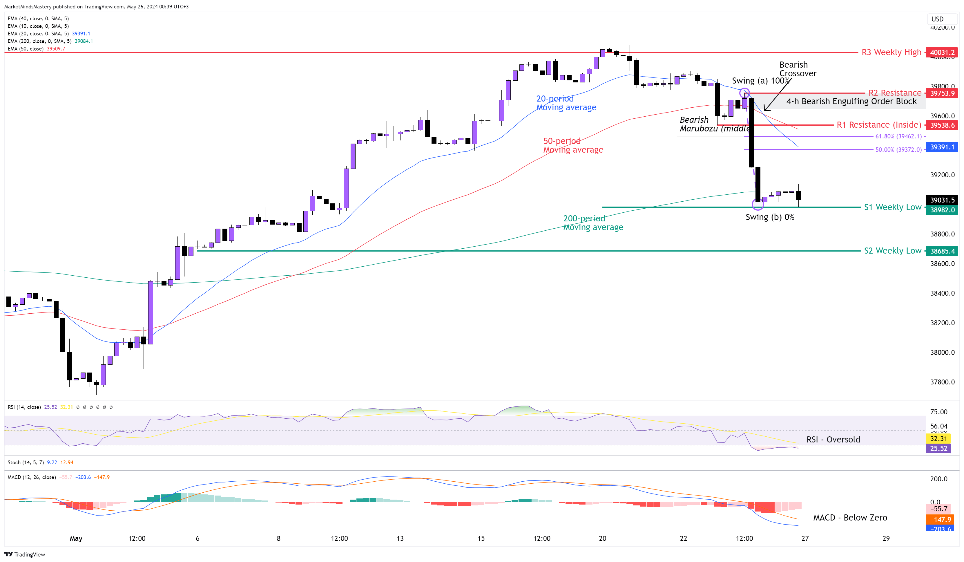 Attualmente, il prezzo si trova in corrispondenza della media mobile a 200 periodi. Se trova un supporto, rimbalza e si muove verso l'alto, la prima area di resistenza, R1, sarà la resistenza interna intorno a 39538 dollari. Questo livello di prezzo è approssimativamente la stessa area del 61,8% di ritracciamento di Fibonacci dallo swing (a) allo swing (b) e con il centro della candela bearish marubozu. Se il prezzo si rompe al di sopra di R1, chiude al di sopra e si muove verso l'alto, la prossima area di resistenza, R2, sarà intorno a 39800 dollari.