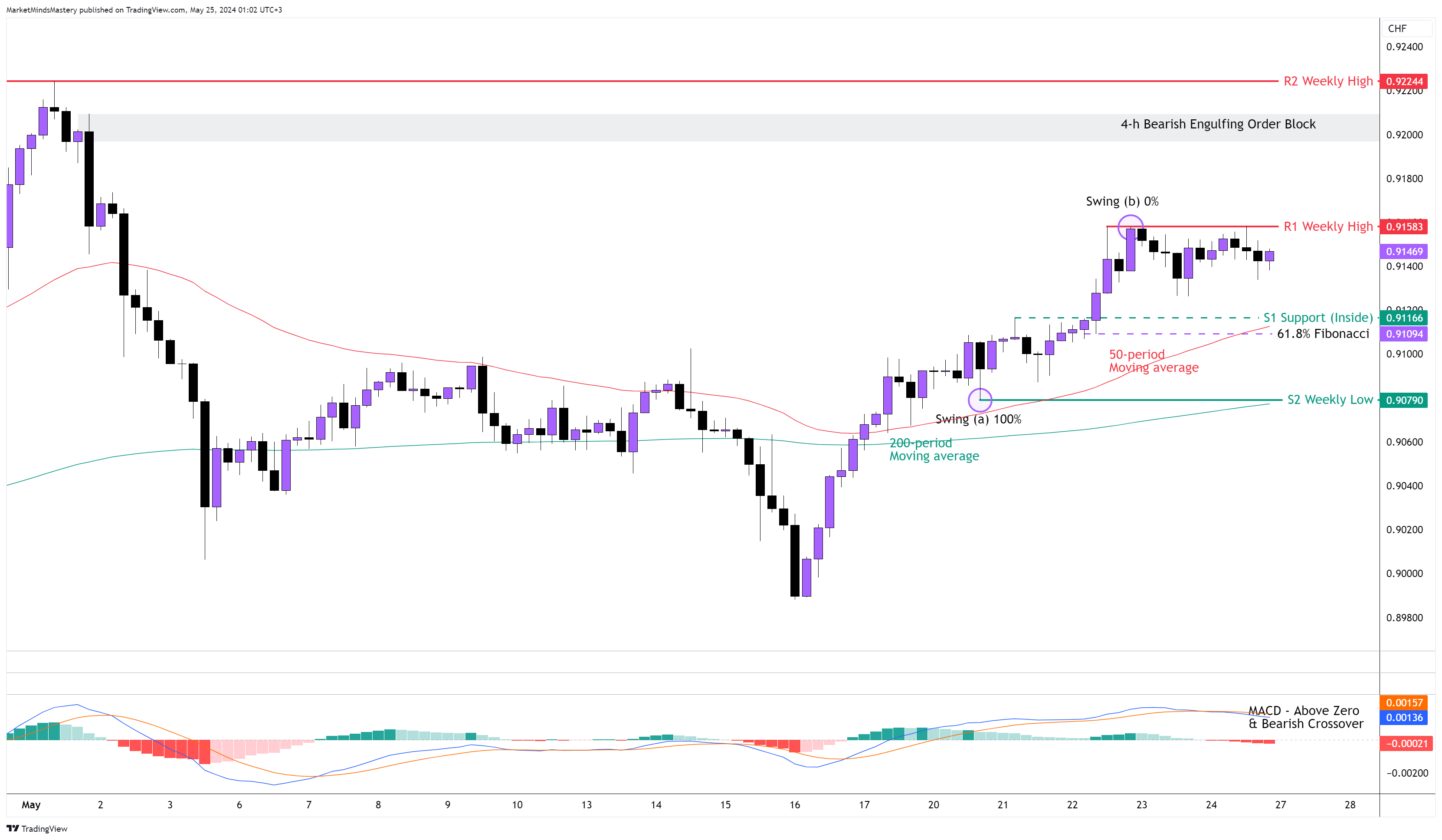 Se il prezzo si muove verso il basso, il primo supporto, S1, è un supporto interno, e si trova intorno a 0,91166. Si trova a una distanza molto ravvicinata con il 61,8% Golder Ratio. Quest'area può essere considerata significativa, non solo per questi due potenziali supporti, ma anche per la media mobile a 50 periodi che si aggrega a questi livelli. Se il prezzo diminuisce ulteriormente e si muove verso il basso, lo swing al punto (a) sarà il prossimo supporto, S2, che si trova intorno a 0,90790. Si tratta del minimo della settimana precedente.