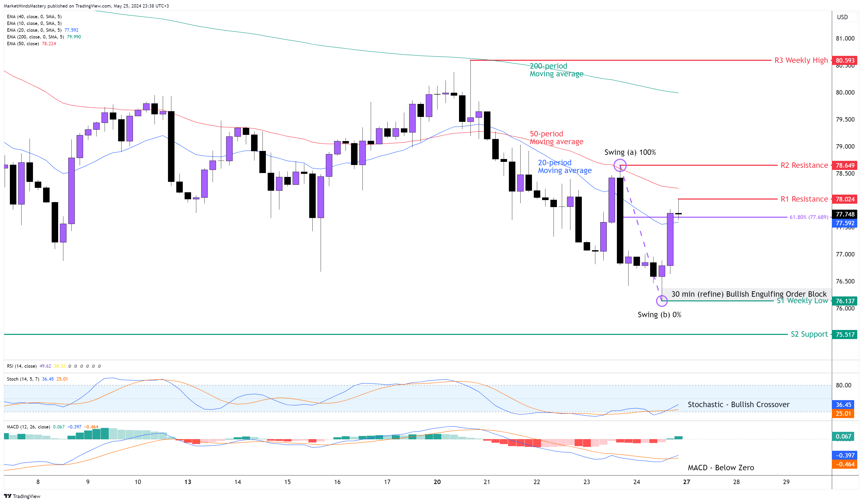 L'Engulfing rialzista sul grafico settimanale non ha avuto seguito la scorsa settimana e il prezzo è stato respinto e si è mosso verso il basso, riprendendo la tendenza al ribasso a 4 ore. Il periodo 20 ha incrociato la media mobile periodo 50, confermando la tendenza al ribasso. Il 200-periodo è al di sopra sia del 20 che del 50 in un'ampia distanza. Lo Stocastico è diventato recentemente ipervenduto, e ora la linea veloce ha incrociato quella lenta, con implicazioni rialziste. Il MACD è sotto lo zero ma con un crossover rialzista in quanto la linea MACD (blu) si incrocia sopra la linea del segnale (arancione), il che spiega che il prezzo è probabilmente in una fase correttiva. Poiché il prezzo fa registrare massimi e minimi inferiori, può essere considerato un trend al ribasso. Se il prezzo continua a scendere, la prima area di supporto, S1, sarà il minimo della settimana precedente a 76,13 dollari. Sul grafico a 30 minuti è stato creato un Order Block rialzista, l'area contrassegnata sul grafico sopra.