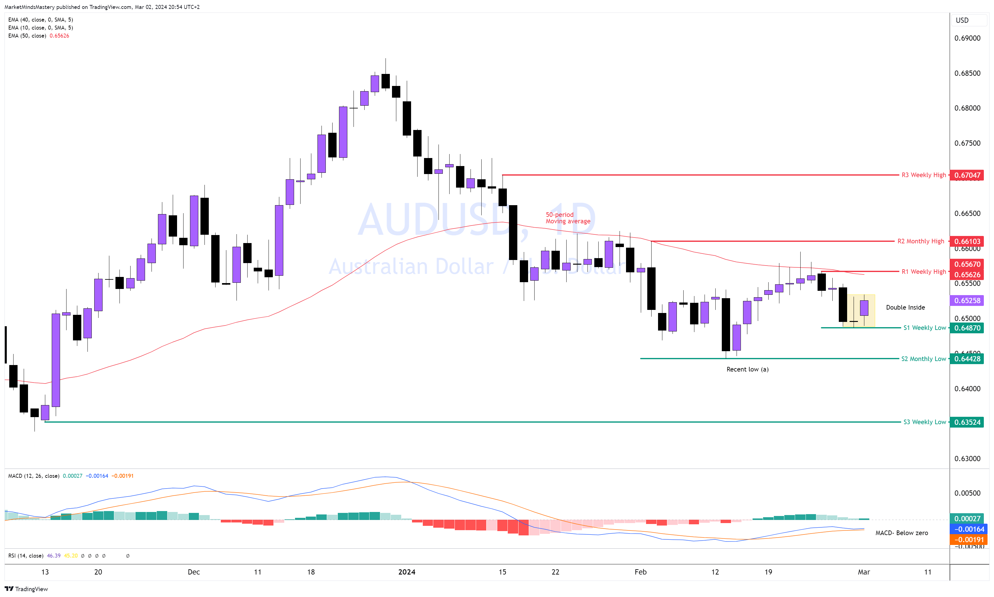 Come previsto la scorsa settimana, il dollaro australiano è sceso. Il prezzo ha creato un supporto intorno a 0,64870, che il grafico precedente indica come il minimo settimanale S1. Il prezzo ha formato un pattern chiamato double inside candele giovedì e venerdì. Il prezzo non ha fatto un nuovo minimo, inferiore a quello di (a), ma è ancora scambiato sotto la media mobile a 50 periodi, il che è ribassista. Anche il MACD è al di sotto della sua linea zero, che è ribassista. Pertanto, se il prezzo si rompe al di sopra del riquadro segnato sul grafico e si muove verso l'alto, la prima resistenza è l'area del cluster della MA dinamica a 50 periodi, e il massimo delle ultime sei settimane è intorno a 0,65670. Se il prezzo rompe e chiude al di sopra di R1, la resistenza successiva, R2, si trova intorno a 0,66103, che è il massimo dell'ultimo mese. Al contrario, se il prezzo scende al di sotto del riquadro e si muove verso il basso, il supporto successivo, S2, è considerato il minimo del mese precedente, intorno a 0,64428.