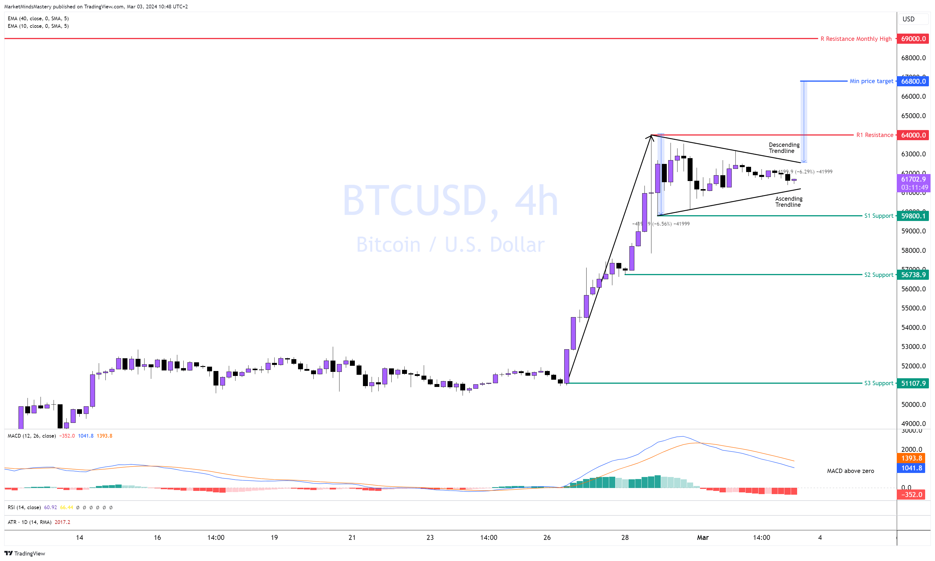 La corsa rialzista è stata evidente la scorsa settimana, quando il Bitcoin ha guadagnato quasi il 20%. Il prezzo ha creato un pattern Bullish Pennant, descritto da un movimento impulsivo verso l'alto, seguito da una correzione all'interno di una trendline ascendente e discendente. Come nel grafico giornaliero, questo modello viene mostrato come un modello di azione del prezzo double inside su un time frame più alto. Di solito si tratta di un pattern di continuazione del trend, e l'aspettativa è una ripresa del trend se il pierce si rompe al di sopra della trendline discendente. Il target minimo di prezzo è la distanza mostrata nel grafico precedente, che è di circa 66.800 dollari in caso di breakout rialzista. Se il prezzo sale, il massimo storico è intorno ai 69.000 dollari. Se il prezzo scende e si muove più in basso, il primo supporto, S1, è di circa 59.800 dollari.