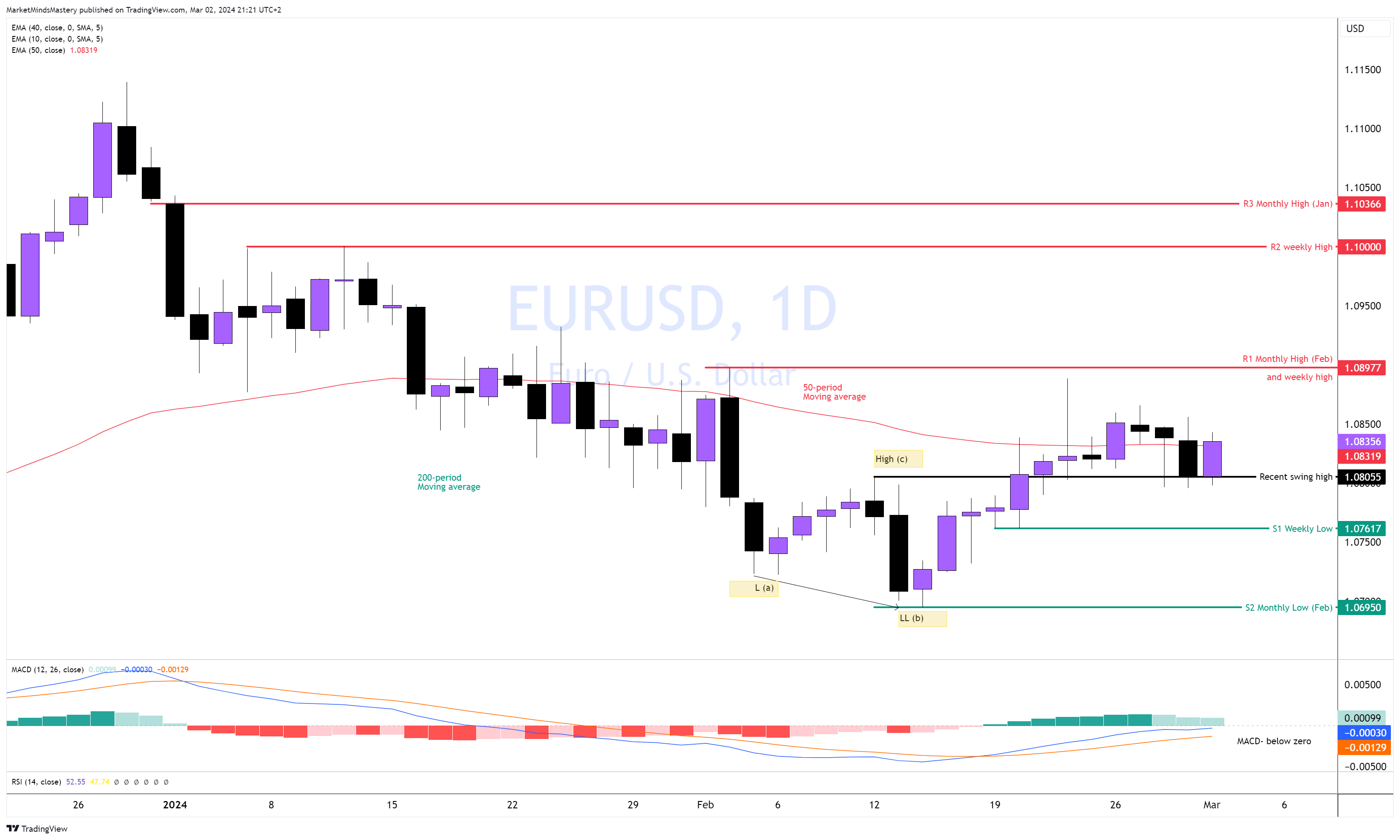 Se l'euro si rafforza sulla base delle aspettative degli eventi macroeconomici e contemporaneamente il NFP causa l'indebolimento del dollaro questa settimana, il prezzo può raggiungere la prima area di resistenza, R1, intorno a 1,08977. Se il prezzo penetra l'area R1 e si muove più in alto, la prossima resistenza, R2, si trova a circa 1,10, un numero tondo significativo per l'EURUSD. D'altro canto, se la situazione macroeconomica favorisce l'USD e il mercato segue la tendenza, il prezzo dovrebbe rompere il punto di oscillazione a ( c) e trovare il supporto S1 intorno a 1,07617. Se il prezzo lo penetra e si muove verso il basso, il supporto successivo, S2, è il recente minimo di oscillazione a (b), circa 1,06950.