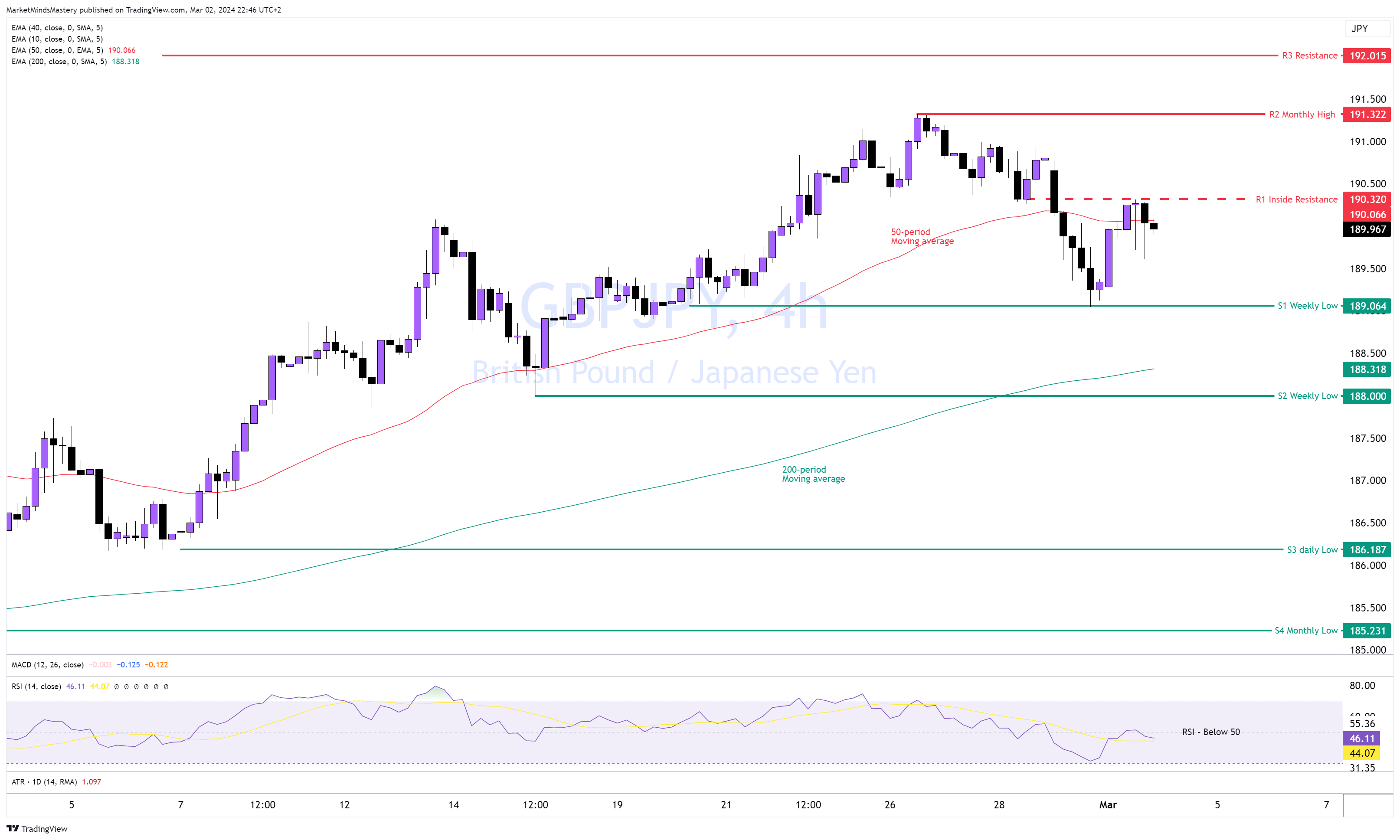 Il prezzo del GBPJPY è diminuito la scorsa settimana, creando una nuova struttura di mercato con massimi e minimi inferiori nel time frame a 4 ore. Il prezzo ha anche rotto e chiuso al di sotto della media mobile a 50 periodi, che è un'indicazione ribassista. Le medie mobili mostrano ancora un movimento al rialzo, ma ricordate sempre che le medie mobili sono indicatori ritardatari. Inoltre, l'RSI è inferiore a 50, indicando un mercato ribassista. si è concluso con una candela ribassista, aggiungendo un'ulteriore conferma ribassista. Se il prezzo continuerà a muoversi al ribasso la prossima settimana, il supporto S1 diventerà la prima area di supporto del mercato. Una rottura e una chiusura al di sotto di esso creeranno un minimo inferiore, e il prezzo potrà muoversi fino alla prossima area di supporto, S2, circa 188.000. Questo punto del grafico è costituito anche dalla media mobile a 200 periodi, che può fungere da supporto dinamico>. Al contrario, se il prezzo rimbalza e si muove verso l'alto, la resistenza interna R1 si trova al di sotto di 190.500. Se il prezzo la penetra e si muove al di sotto di essa, il prezzo può muoversi fino alla prossima area di supporto, S2, circa 188.000. Se il prezzo la penetra e si muove verso l'alto, la prossima resistenza, R2, si trova a circa 191.322..