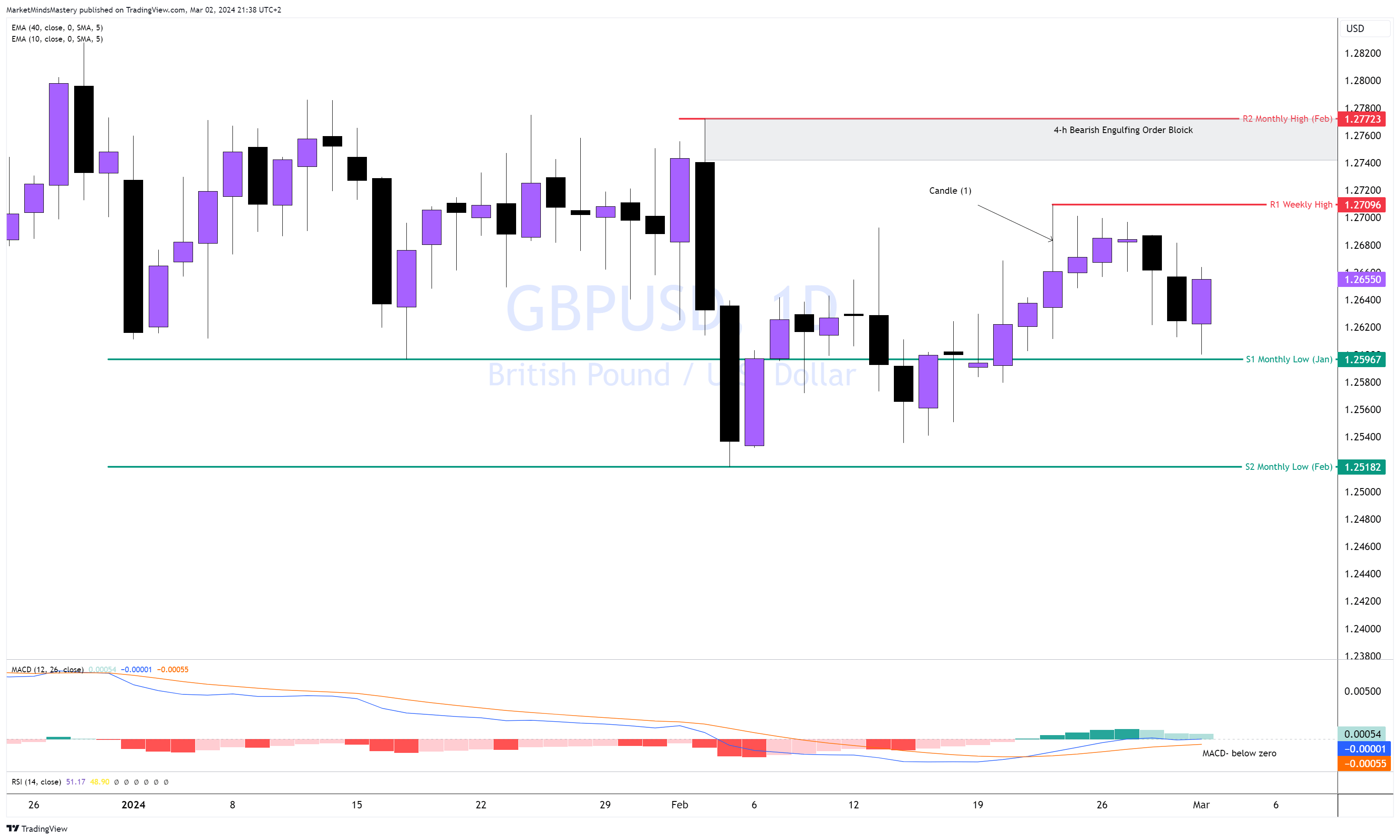 I confini della candela (1) sono apparsi come livelli intraday significativi la scorsa settimana, con il prezzo che è rimasto entro i suoi limiti per i precedenti cinque giorni di trading. Osservando il time frame settimanale, identifichiamo una candela settimanale interna. Il mercato è senza tendenza in quanto il prezzo non si muove in nessuna direzione con massimi o minimi definiti. Pertanto, è necessario prestare meno attenzione al MACD. Venerdì scorso, il prezzo ha trovato supporto intorno al minimo di gennaio e ha rimbalzato verso l'alto. Blocco d'ordine bearish engulfing.