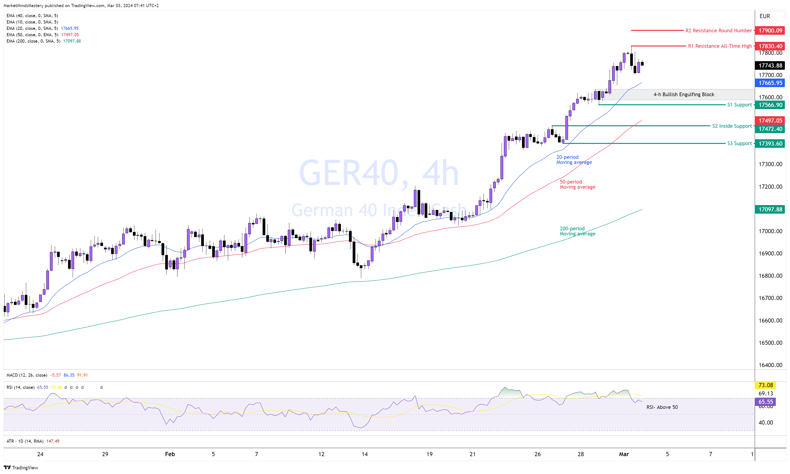 L'enorme movimento rialzista del GER40 ha creato un nuovo massimo storico la scorsa settimana. RSI è ancora sopra 50, considerando un mercato toro. Tutte e tre le medie mobili sono in ordine: 20 è al di sopra di 50, ed entrambe sono al di sopra di 200, indicando rialzismo. Il prezzo fa massimi e minimi più alti, indicando pressione d'acquisto. Mercoledì scorso, sul grafico a 4 ore è stato creato un blocco d'ordine rialzista che non è stato testato. Se il prezzo continua a salire, la resistenza R1, che si trova al massimo storico intorno a 17830, sarà la prima area di resistenza. Una rottura al di sopra di essa può far muovere il prezzo verso la resistenza successiva: R2, circa 17900, o 18000. Ricordate che, poiché il mercato raggiunge i massimi storici in ogni rally al rialzo, non ci sono resistenze precedenti da usare come riferimento sul grafico. blocco d'ordine rialzista, come si vede nel grafico. Se il prezzo penetra questo supporto e si muove verso il basso, l'area di supporto successiva, S2, è un supporto interno di circa 17472.