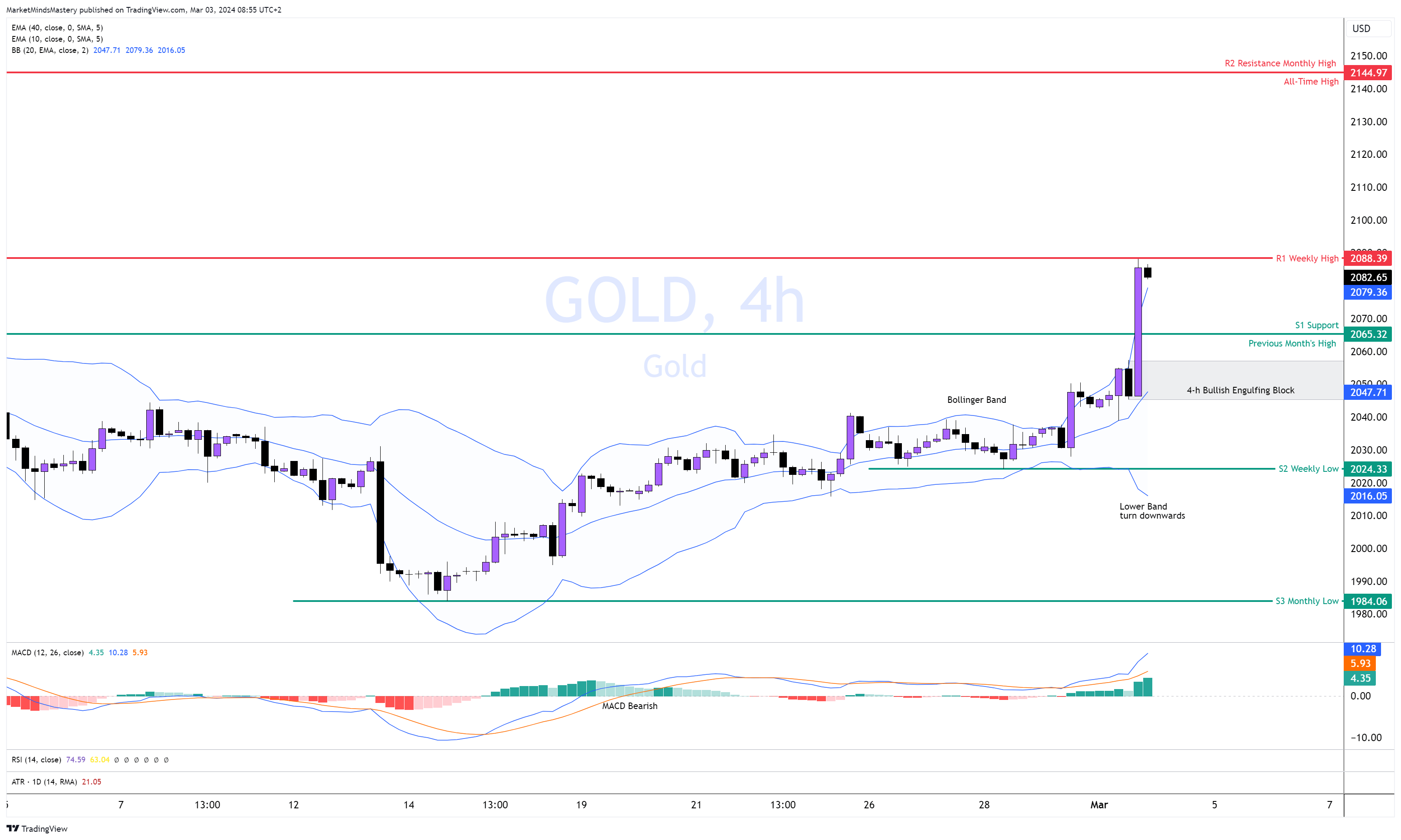Dopo aver raggiunto tutti i livelli di prezzo che abbiamo segnato la scorsa settimana nella nostra analisi, il prezzo dell'oro è esploso verso l'alto, lasciandosi alle spalle un nuovo blocco d'ordine. Il time frame settimanale è in una tendenza al rialzo, e il prezzo fa massimi più alti e chiude più in alto. Guardando al time frame a 4 ore, il prezzo si è espanso verso l'alto durante la fine della sessione di trading di venerdì scorso. La banda di Bollinger inferiore è stata girata verso il basso quando il prezzo ha superato la banda superiore. Questo dimostra un forte movimento rialzista. Allo stesso tempo, il prezzo ha costretto l'oscillatore RSI in una condizione di sovrapprezzo. Questo indica la forza rialzista dell'oro. Il prezzo si è fermato esattamente su un vecchio massimo settimanale, che segna la resistenza R1, intorno a 2088. Se questa settimana il prezzo rompe la resistenza R1 e si muove verso l'alto, la prossima resistenza del mercato è il prezzo all-time high di circa 2144. L'esito dei NFP sarà un evento significativo per lo sviluppo del prezzo dell'oro.