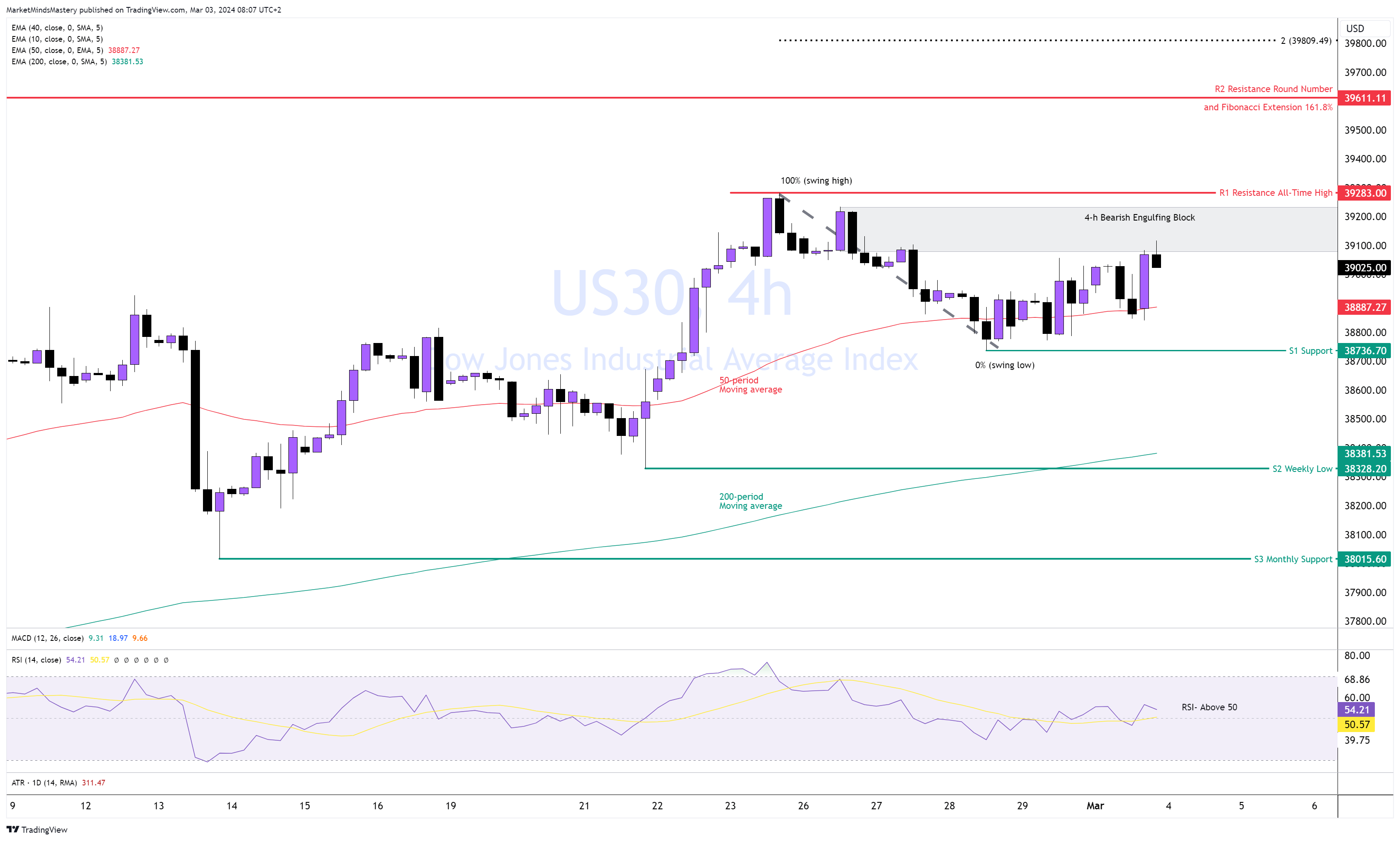 La scorsa settimana, il prezzo ha chiuso come una candela interna sul grafico settimanale US30. Il prezzo è ancora in una solida tendenza al rialzo, quindi la media mobile a 50 periodi è ben al di sopra di quella a 200 periodi. Nel time frame a 4 ore, l'ultima gamba d'impulso è stata realizzata dal minimo e dal massimo della settimana precedente. Nessuno di essi è ancora penetrato. Sono stati creati diversi Bearish Engulfing Order Block intorno al massimo storico. Anche l'RSI mostra una tendenza rialzista tra le medie mobili, dato che la linea è superiore a 50. Pertanto, se il prezzo continuerà a muoversi verso l'alto e penetrerà il blocco degli ordini, potrà raggiungere la resistenza R1 intorno a 39283. Se il prezzo penetra la R1 e chiude al di sopra di essa, creerà un nuovo massimo storico. Utilizzando l'estensione Fibonacci, segniamo il 161,8% intorno a 39600 come prossima resistenza. Al contrario, se il blocco dell'ordine bearish engulfing e R1 reggono, il prezzo diminuirà e si muoverà verso il basso. La prima area di supporto, S1, si trova intorno a 38736. Un movimento al di sotto di S1 può spingere il prezzo a testare il minimo della scorsa settimana, il supporto S2, intorno a 38300.