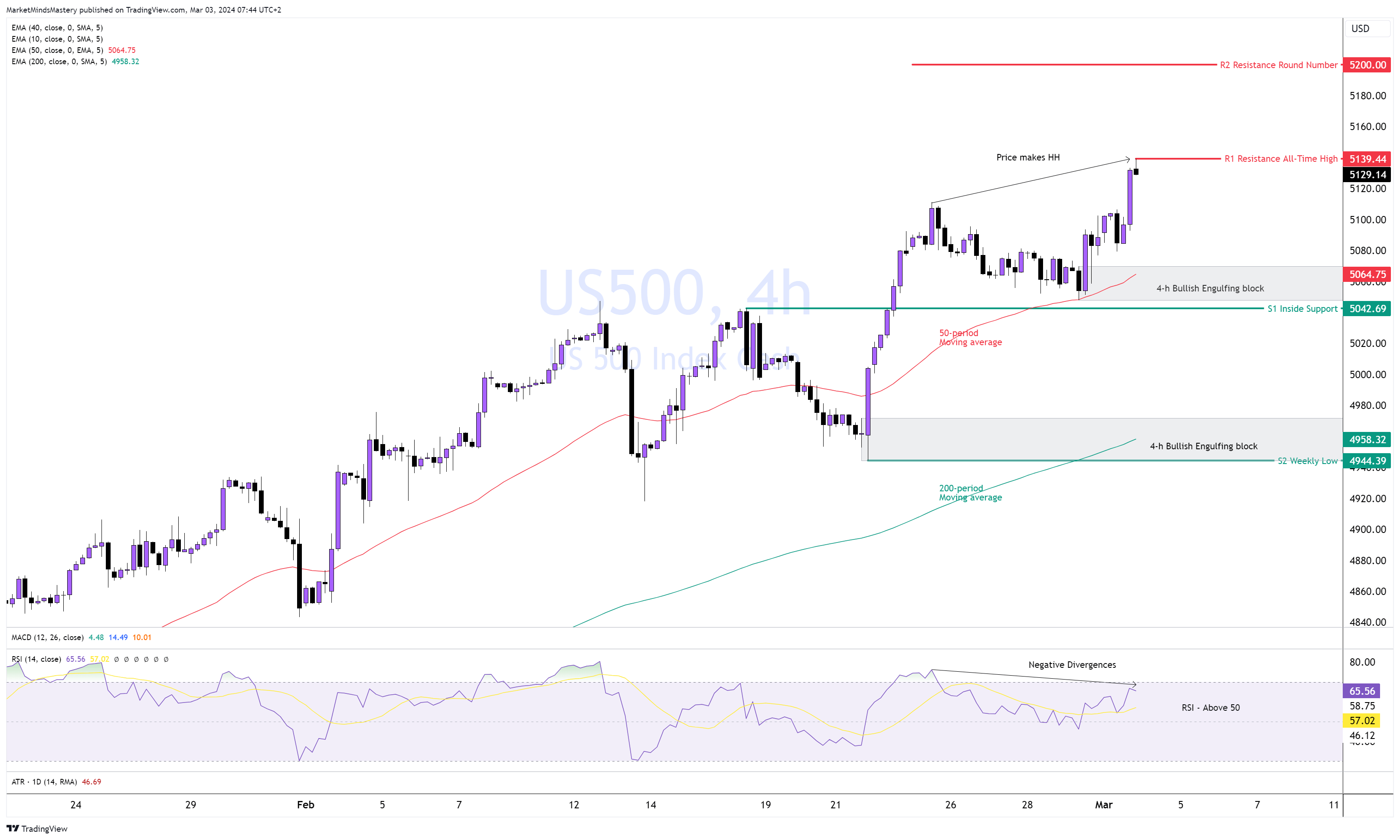 Il mercato non ha smesso di fare nuovi massimi; l'ultima settimana si è conclusa con un nuovo massimo storico di circa 5139. Anche se il prezzo ha raggiunto un nuovo massimo storico, il movimento al rialzo è stato accompagnato da divergenze negative o ribassiste sull'RSI. Ciò indica una mancanza di slancio durante l'ultimo impulso al rialzo. Questo può causare una correzione dei prezzi, ma non è un caso garantito. Se il prezzo diminuisce e si muove verso il basso, la prima area di supporto, S1, è un supporto interno e proprio sopra di essa si trova la media mobile a 50 periodi, che può agire come supporto dinamico. Nella stessa area è stato creato un Bullish Engulfing Order Block a 4 ore. Se il prezzo si muove al di sotto della S1, il prossimo supporto è la S2, al di sotto della 5000. Lì, troviamo un altro blocco di ordini Bullish engulfing. Il supporto S2 si trova su un minimo settimanale, che può attirare l'attenzione di molti partecipanti al mercato. Al contrario, se il prezzo sale, raggiungerà un nuovo massimo storico. Utilizzeremo un nuovo numero tondo, che questa volta sarà 5200.