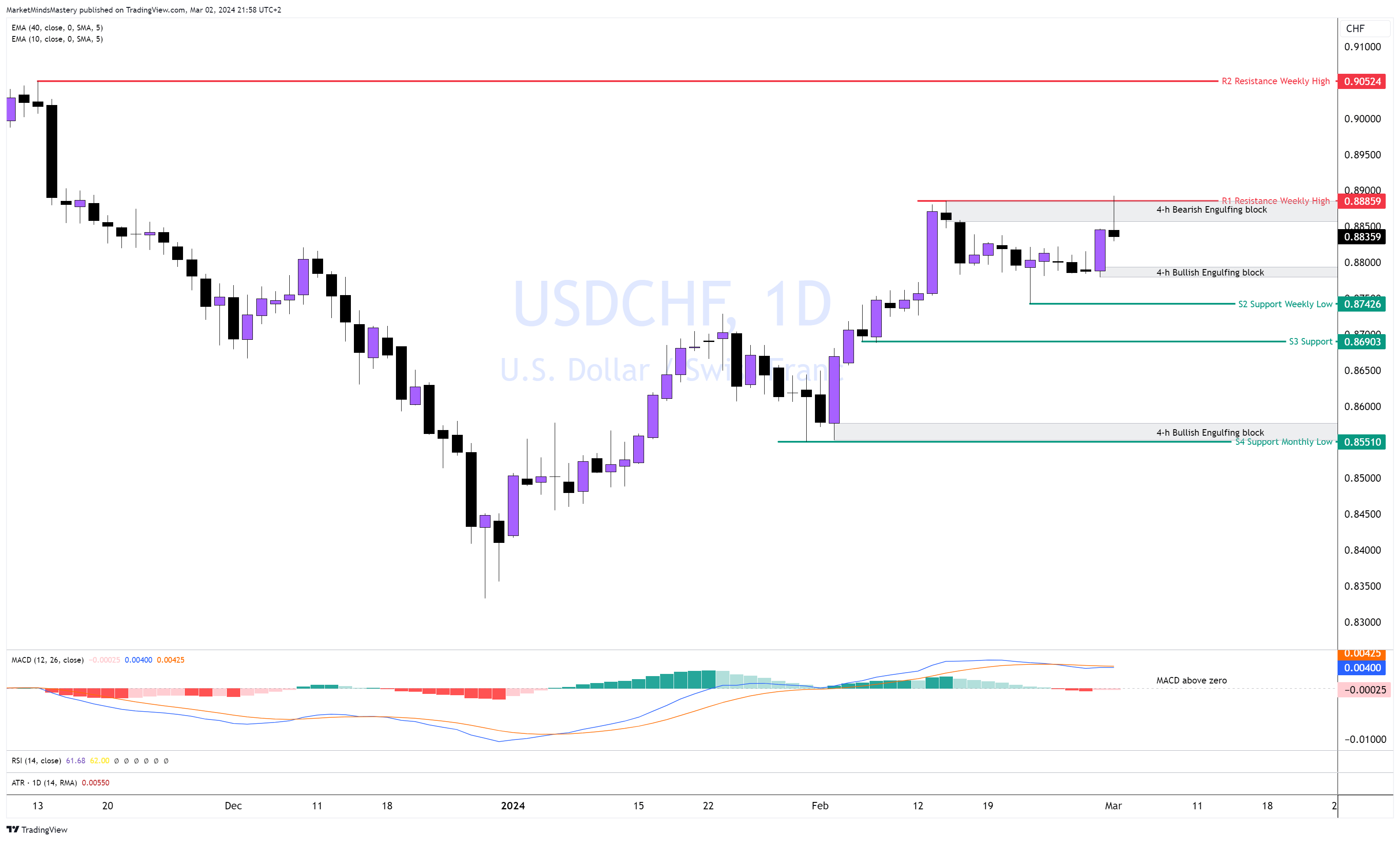 Come previsto dalla scorsa settimana, il prezzo si è mosso al rialzo e ha trovato una forte resistenza intorno alla media mobile dinamica a 200 periodi e al Bearish Engulfing Order Block a 4 ore per poi scendere, lasciando dietro di sé un modello ribassista ben definito di shooting star. Inoltre, il prezzo non è riuscito a chiudere al di sopra dell'ultimo massimo di oscillazione. Se la Svizzera guadagna forza, il prezzo della coppia può scendere, e la prima zona di supporto è un Bullish Engulfing Order Block a 4 ore che coincide con il forte supporto intraday, appena sotto 0,88000. Se il prezzo scende ulteriormente, il minimo della settimana precedente può fungere da supporto S2 intorno a 0,87426. Solo dopo la rottura del supporto S2, il fallimento dello swing high sarà considerato un modello di inversione double-top. Altrimenti, il prezzo potrebbe rimbalzare e muoversi verso l'alto, creando un triangolo ascendente. Se il prezzo si muove verso l'alto, la resistenza R1 può essere testata nuovamente. Se il prezzo la rompe e chiude al di sopra di essa, c'è spazio per il prezzo per muoversi fino alla prossima resistenza R2, intorno a 0,90524.
