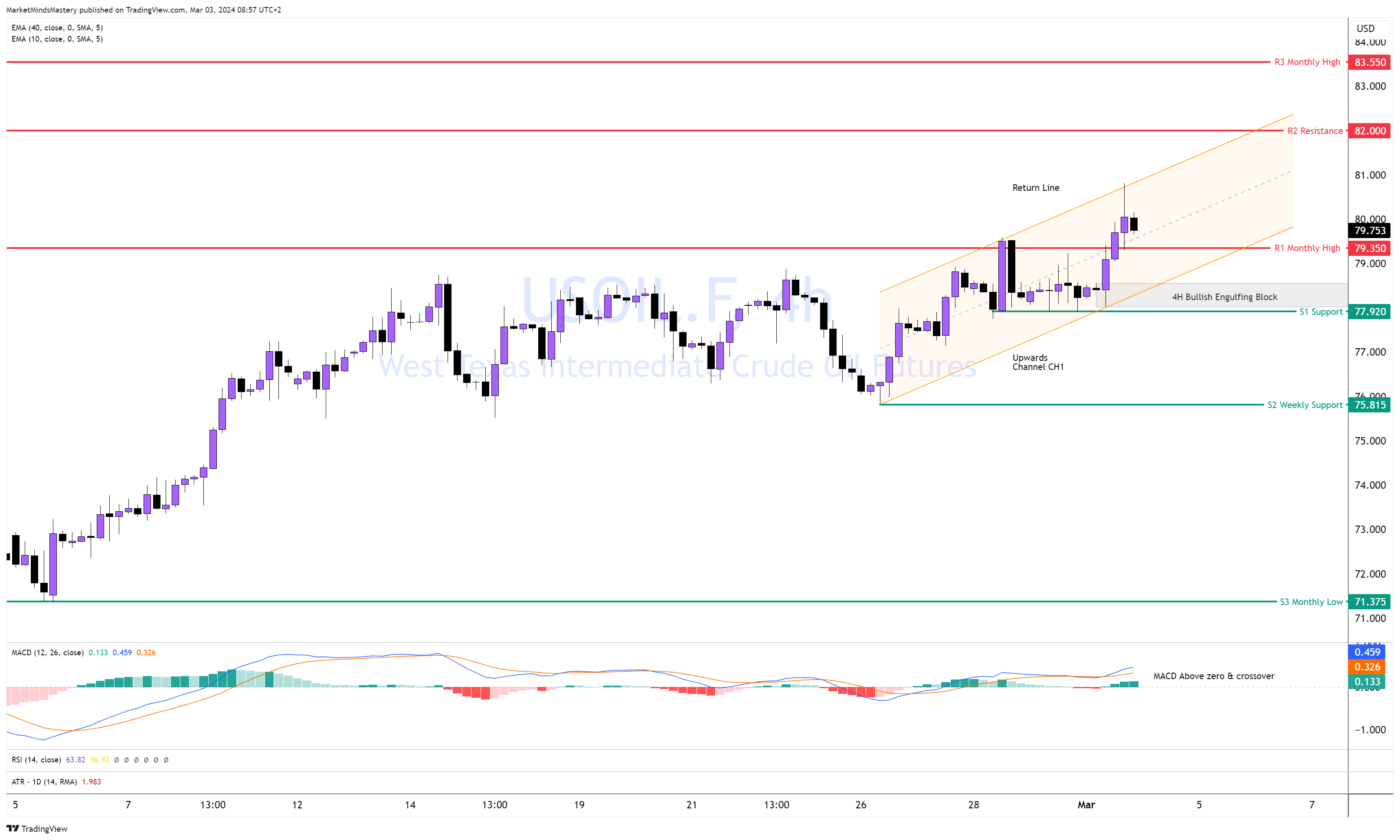 Il prezzo dell'USOil è entrato nel ben definito blocco di ordini di tipo bullish engulfing a 4 ore che abbiamo segnato sul time frame a 4 ore e ha rimbalzato, muovendosi verso l'alto, la scorsa settimana: da allora il prezzo è stato scambiato intorno all'area di 79 dollari. Il prezzo ha fluttuato per circa due giorni senza che i venditori riuscissero a spingere il prezzo lontano dall'area di resistenza. Questo è stato un indizio del mercato che la resistenza è soggettiva a un breakout al rialzo, che è avvenuto venerdì scorso. Il prezzo ha raggiunto un nuovo massimo sopra gli 80 dollari. Il MACD è al di sopra della linea dello zero, e la linea del MACD incrocia sopra la linea del segnale, che è un segnale rialzista. È possibile tracciare un canale al rialzo CH1 a breve termine. Se il prezzo rimane al di sopra del massimo mensile recentemente rotto e continua a muoversi verso l'alto, la prossima resistenza è di circa 82 dollari. Se il prezzo scende e si muove verso il basso, il canale CH1 può fungere da supporto e spingere il prezzo a risalire. Tuttavia, se il prezzo penetra nella parte inferiore del canale CH1 e scende ulteriormente, il supporto S1 si trova a circa 78 dollari. Nella stessa area, si trova un blocco d'ordine rialzista a 4 ore (Bullish engulfing). Per un ulteriore calo, individuare il minimo della scorsa settimana intorno a $75.