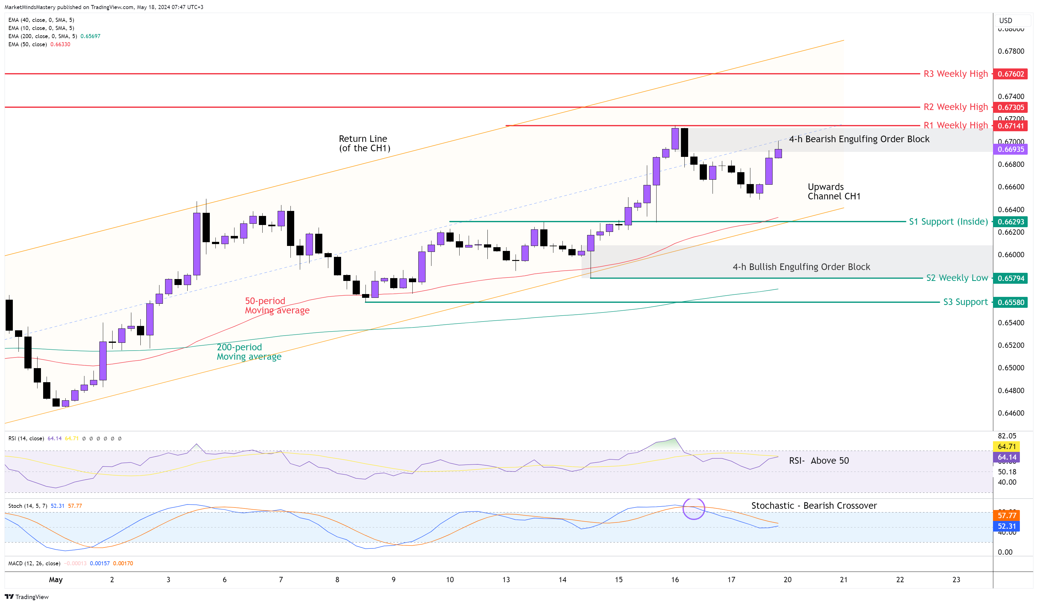 The positive number on the Unemployment Rate in Australia last week helped the Aussie maintain a bullish upward move and formed higher highs and higher lows on the 4-hour chart. The price is trading within a valid Upwards Channel CH1. The Channel’s Trendline tested successfully three times and held. The RSI indicates bullishness as it trades above 50, the middle line. The Stochastic oscillator created a Bearish Crossover, indicating the price correction phase. The 50-period moving average is above the slow 200-period, indicating a bullish sentiment in the currency pair. The price created a Bearish Engulfing Order Block last week, with its highest point being the previous week’s high R1, around 0.6714. The Order Block and the R1 resistance must be penetrated by the price for the uptrend to continue. If the price closes above R1, the next resistance will be the R2 level at around 0.6730, approximately 15 pips above the R1. If the R2 level penetrates successfully, the next resistance, R3, is a weekly high of around 0.6760. Opposively, if the price declines and moves downwards, the first support area, S1, is approximately 0.6629. The level consists of the most recent swing high, the 50-period moving average - considering the market volatility won't change drastically, and the Upward Trendline of the CH1 channel. If the price closes under the S1 and moves downwards, the next support, S2, is the previous week’s low, at 0.6579. The price at this level formed a Bullish Engulfing Order Block, which can cause the price to have a noticeable reaction.