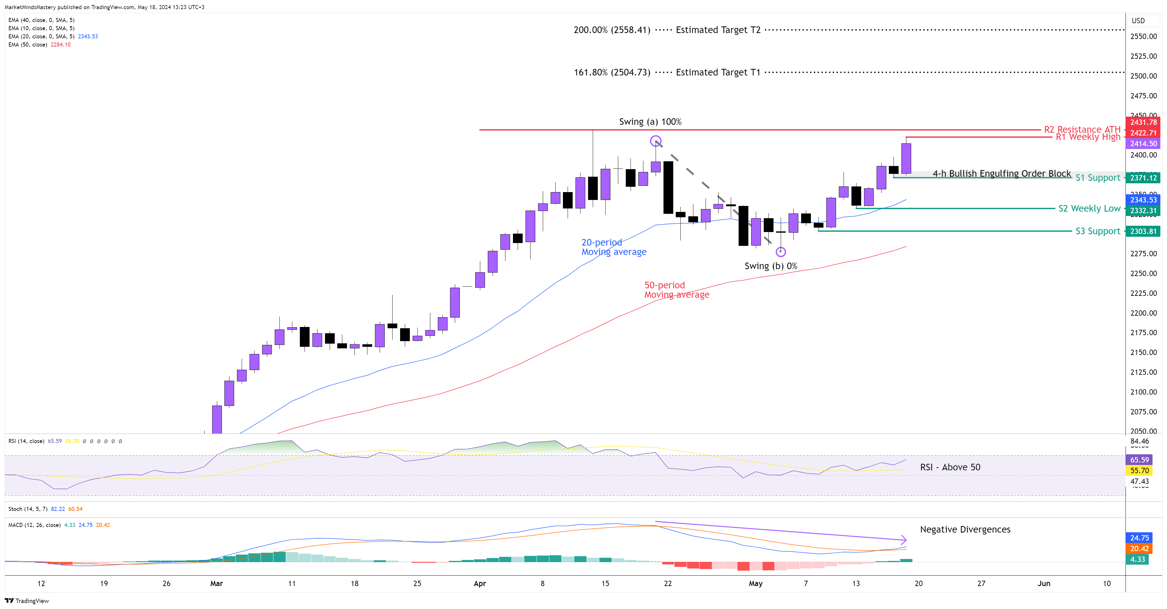 The uptrend in the Gold market continued last week, with the retracement occurring exactly at 61.8%, as we pointed out in the previous week’s analysis (Market Outlook GOLD 4H 13-19/5).  Since then, the price rally has continued the Higher Highs and Higher Lows series. This week, we will analyse the Daily chart since the price is approaching an ATH (All-Time High). As the market is in a strong uptrend, the 20-period is above the 50-period moving average, with the distance between them widening. The RSI is well above the 50, which is a bullish sign. The MACD, as it takes the 24 periods into account, is considered a slower indicator than the RSI. Therefore, the MACD shows noticeable Bearish or Negative Divergences B’ Class, which means that the price made equal top and the MACD lower high. This indication can set the price on a set-back, at least temporarily. If the price continues moving upwards, the previous week’s high should be violated, and a close above the R1 resistance, which is around $2422, should occur. If this happens, the ATH, as marked on the chart with the R2 resistance, is around 200 pips above the $2431. If the price breaks above the ATH, then using the Fibonacci Extension, we marked 161.8% and 200%.