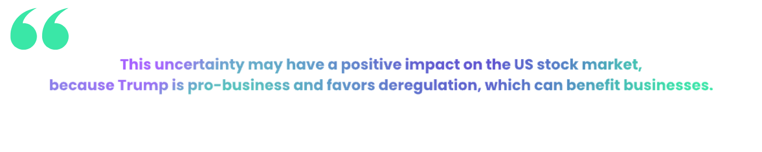 Buna karşılık, Trump kazanırsa, piyasada daha fazla belirsizlik ve istikrarsızlık olacaktır. Ancak bu belirsizliğin ABD borsası üzerinde olumlu bir etkisi olabilir çünkü Trump iş dünyası yanlısıdır ve işletmelere fayda sağlayabilecek deregülasyondan yanadır.