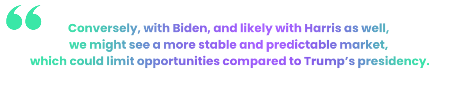 Tersine, Biden ve muhtemelen Harris ile birlikte, Trump'ın başkanlığına kıyasla fırsatları sınırlayabilecek daha istikrarlı ve öngörülebilir bir piyasa görebiliriz.