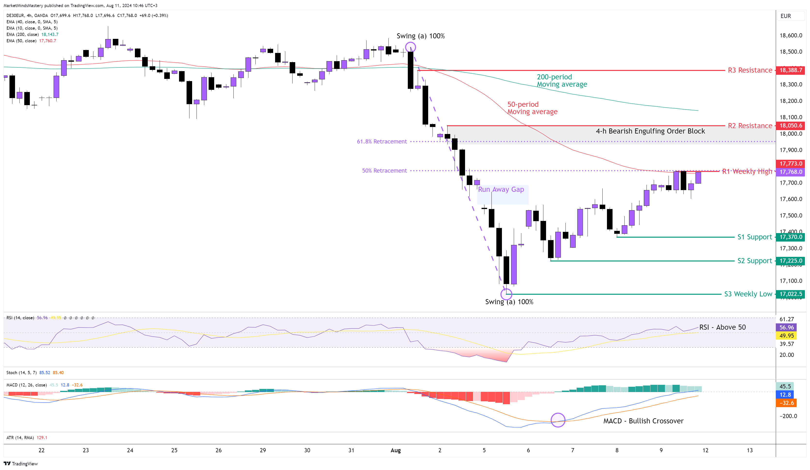 Bir önceki haftaki düşüşün ardından, GER30'un fiyatı geçtiğimiz Pazartesi günü düşmeye devam etti ve aynı gün içinde dolan bir Run Away Gap yarattı. Kaçış Boşluğu genellikle güçlü bir trend sırasında görülür. Trendin nihai hedefine zaten yarı yolda olduğunu işaret eder. Bir trendin ne zaman sona ereceğinden% 100 emin olamasak da, trendle pozisyon ticareti yapana kadar bu bilgilere dayanarak tahmin edebiliriz. Haftalık mum bir Çekiç tersine dönüş fiyat hareket modeli oluşturdu. RSI Osilatörü 50'nin üzerinde, bu da yükseliş anlamına geliyor. MACD göstergesi sıfırın altında ve çok uzağındayken MACD Çizgisi (Mavi) Sinyal Çizgisinin (Turuncu) üzerine geçtiği için bir Boğa geçişi oluşturdu. Boğa geçişi, fiyatın büyük olasılıkla düzeltici bir aşamaya başlayacağını gösterir. Fibonacci geri çekilme aracını kullanarak, (a) salınımından (b) salınım noktasına kadar, fiyat şimdiye kadar % 50 geri çekildi. Şu anda fiyat 17768 olan %50 Fibonacci geri çekilme seviyesinde ve 50 dönemlik hareketli ortalama ve bir önceki haftanın en yüksek seviyesi olan R1 ile bir arada bulunuyor. Bu nedenle, fiyat Pazartesi gününden itibaren haftalık Boğa çekicini takip eder ve fiyat yukarı doğru hareket ederse, bir sonraki direnç alanı olan R2, birkaç hafta önce bir Ayı Yutan Emir Bloğu yaratan bir seviye olan 18050 $ olacaktır. Daha da yukarı doğru bir hareket, 18388 civarında bir sonraki direnç alanı olan R3'ü bulacaktır. Tersine, fiyatın düştüğünü ve aşağı doğru hareket ettiğini varsayalım, o zaman ilk destek alanı olan S1, en son düşük salınım olduğu için 17370 olacaktır. Fiyat S1'e nüfuz eder ve düşmeye devam ederse, bir sonraki destek alanı S2 17225 olacak ve S3 bir önceki haftanın en düşük seviyesi olan 17022 olacaktır.