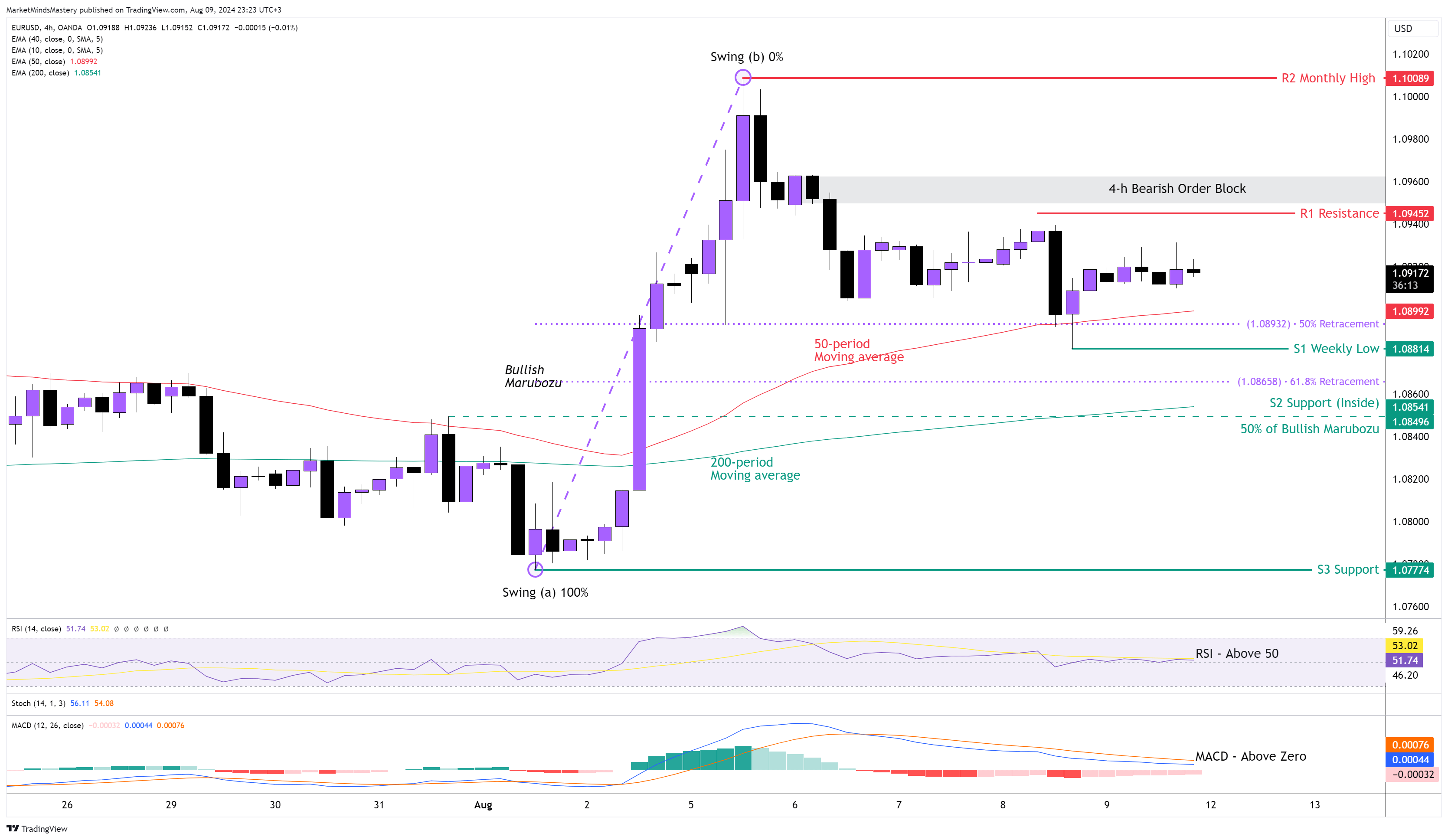 Bir önceki haftanın Piyasa Görünümünün ardından, geçtiğimiz Pazartesi günü EURUSD fiyatı kısa bir süre için yukarı yönlü hareketini sürdürdü. Salı gününden itibaren, Günlük ATR (Ortalama Gerçek Aralık) değerinin altında olan ortalama 60 pip dar bir aralıkta işlem gördü. Bu, en çok işlem gören döviz çiftindeki yana doğru hareketi gösterir ve yukarı doğru işlem görmeye devam edip etmeyeceği konusunda piyasa kararsızlığının bir işaretidir. Haftalık grafik, genellikle Ayı etkilerine sahip olan Uzun Üst Fitil mumu ile sona erdi. 4 saatlik grafik, fiyat en son düşük dalgalanmayı ihlal etmeden daha yüksek bir formasyonu koruduğu için yukarı yönlü bir hareketi sürdürüyor. 50 periyot, 200 periyotluk hareketli ortalamanın üzerinde kalmaya devam ediyor ve bunun bir yükseliş anlamı var. RSI orta çizgisi olan 50'nin üzerindedir ve bu da bir başka yükseliş göstergesidir. MACD sıfır çizgisinin üzerindedir, ancak Histogramı Düzdür ve son birkaç işlem günü boyunca döviz çiftinin yana doğru hareketini teyit eder. Geçtiğimiz Cuma günü, fiyat destek buldu ve grafikte gösterildiği gibi 50 dönemlik hareketli ortalamadan ve % 50 Fibonacci geri çekilmesinden sıçradı. Bu nedenle, fiyat yukarı yönlü hareketine devam ederse, ilk direnç alanı olan R1, 1.09452 olacaktır. Fiyat R1'e nüfuz eder ve artmaya devam ederse, en yakın Bearish Order Block 1.09600 civarındadır ve fiyatın direnç bulabileceği bir alan olarak kabul edilir. Yukarı doğru bir hareket, bir sonraki statik direnç R2'yi bulacaktır, yaklaşık 1.10, bu genellikle tüccarların dikkatini çekebilecek yuvarlak ve psikolojik bir sayıyı temsil eden önemli bir fiyat seviyesidir. R2'nin üzerinde bir kırılma, piyasada bir yükseliş trendi oluşturacaktır. Öte yandan, fiyat reddedilir ve aşağı doğru hareket ederse, ilk destek alanı olan S1, önceki haftanın en düşük seviyesi olan 1,08814 civarında olacaktır. Fiyat S1'e nüfuz eder ve düşmeye devam ederse, bir sonraki destek olan S2 bir iç destek olacaktır ve Bullish Marubozu mumunun ortası ve 200 dönem hareketli ortalama ile bir arada bulunur.