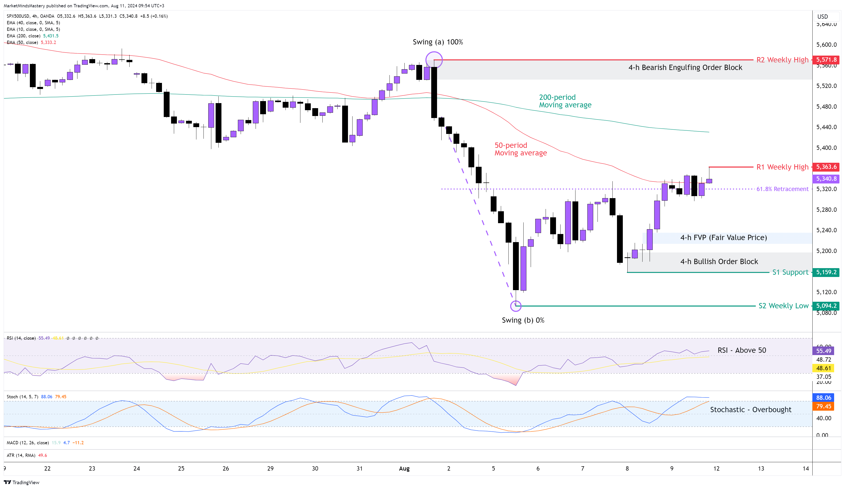 SP500, geçtiğimiz Pazartesi günü tüm ABD Endeksleri 5080$'a kadar işlem görürken düşüşü takip etti ve ardından sıçrayarak yukarı doğru hareket etti ve haftalık grafikte uzun bir alt fitili olan bir Bullish Hammer oluşturdu. Haftalık grafikte, burada göstermememize rağmen, aynı fiyat hareketi, yükseliş etkileri olan 40 dönemlik hareketli ortalamayı reddetti. 4 saatlik grafikte, fiyat 5200$ civarında bir Bullish Order Block ve 5220$ civarında bir FVP (Fair Value Price) oluşturdu. 50 periyot, 200 periyotluk hareketli ortalamanın altında ve bu düşüş eğilimi gösteriyor. RSI 50'nin üzerinde ve yükseliş eğilimi gösteriyor. Stochastic Osilatör aşırı alım durumunda ve bu yükseliş anlamına geliyor. Fiyat, (a) Swing noktasından (b) Swing noktasına olan hareketinin yaklaşık %61,8'ini geri çekti ve 5340 $ civarında para birimi. Bu nedenle, fiyat reddedilir ve aşağı doğru hareket ederse, ilk destek alanı olan S1, 5159 $ civarında olacaktır. Fiyatın S1'e girmesi ve düşmeye devam etmesi durumunda, bir sonraki destek alanı olan S2, önceki haftanın en düşük seviyesi olan 5094 $ civarında olacaktır. Tersine, 4 saatlik grafikteki fiyat haftalık Boğa fiyat hareketini takip eder ve yukarı doğru hareket ederse, ilk direnç alanı olan R1, bir önceki haftanın en yüksek seviyesi olan 5363 $ civarında olacaktır. Fiyat R1'e nüfuz eder ve artmaya devam ederse, bir sonraki direnç alanı olan R2, yaklaşık 5571 $ 'lık bir başka haftalık yüksek olacaktır.